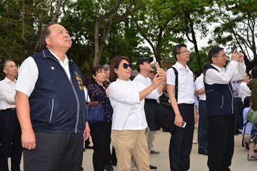 今日嘉義市長黃敏惠參訪台中花博,於副市長陳子敬、人事處長陳杉根等人陪同下參觀后里森林園區,來到大型裝置藝術《聆聽花開的聲音》前,對於這朵地表最大機械花由697朵火紅色小花組成,可進行音樂、燈光、機械花開表演,還可與遊客互動,十分有興趣,頻頻拿出手機來照片。