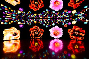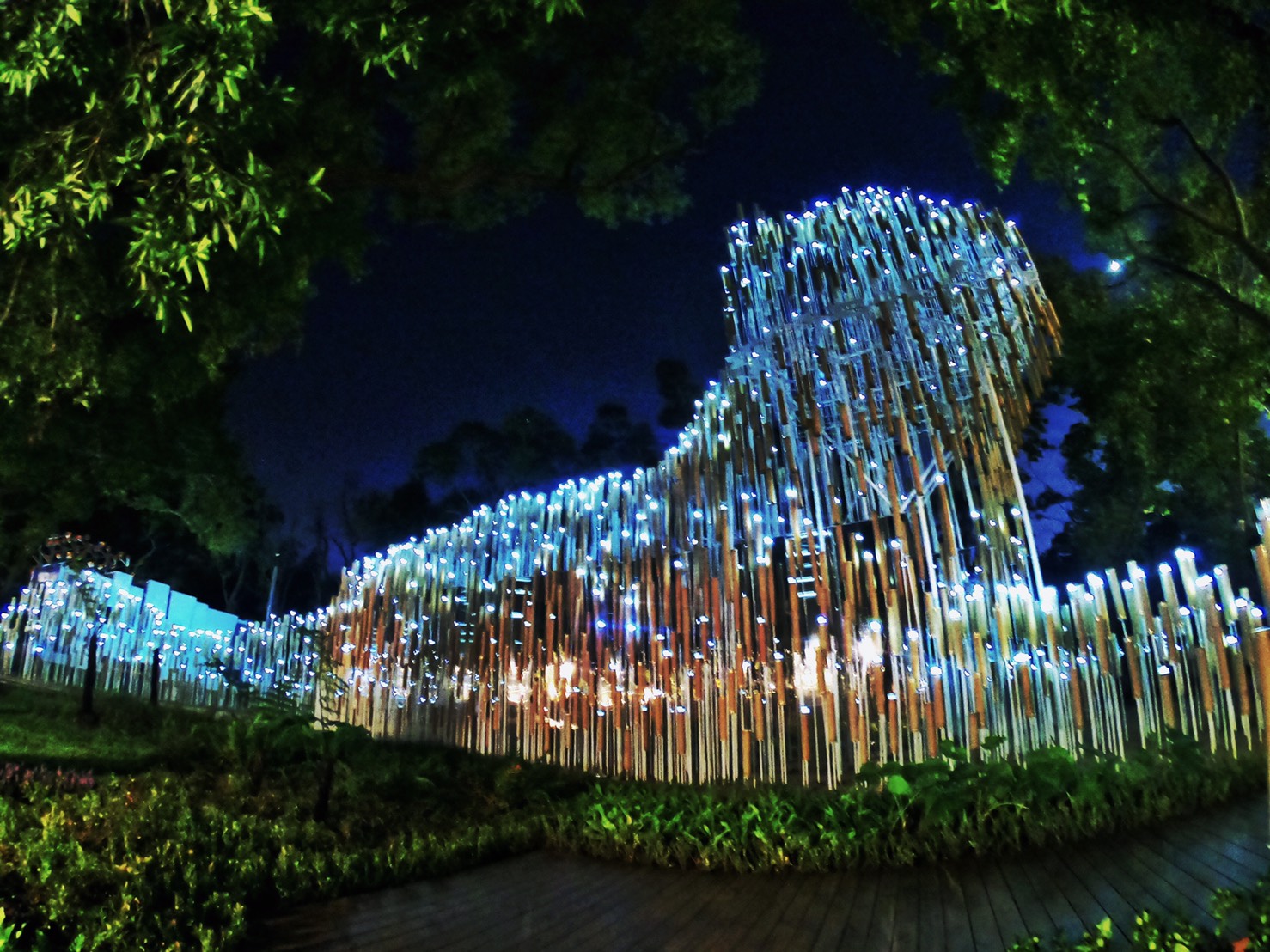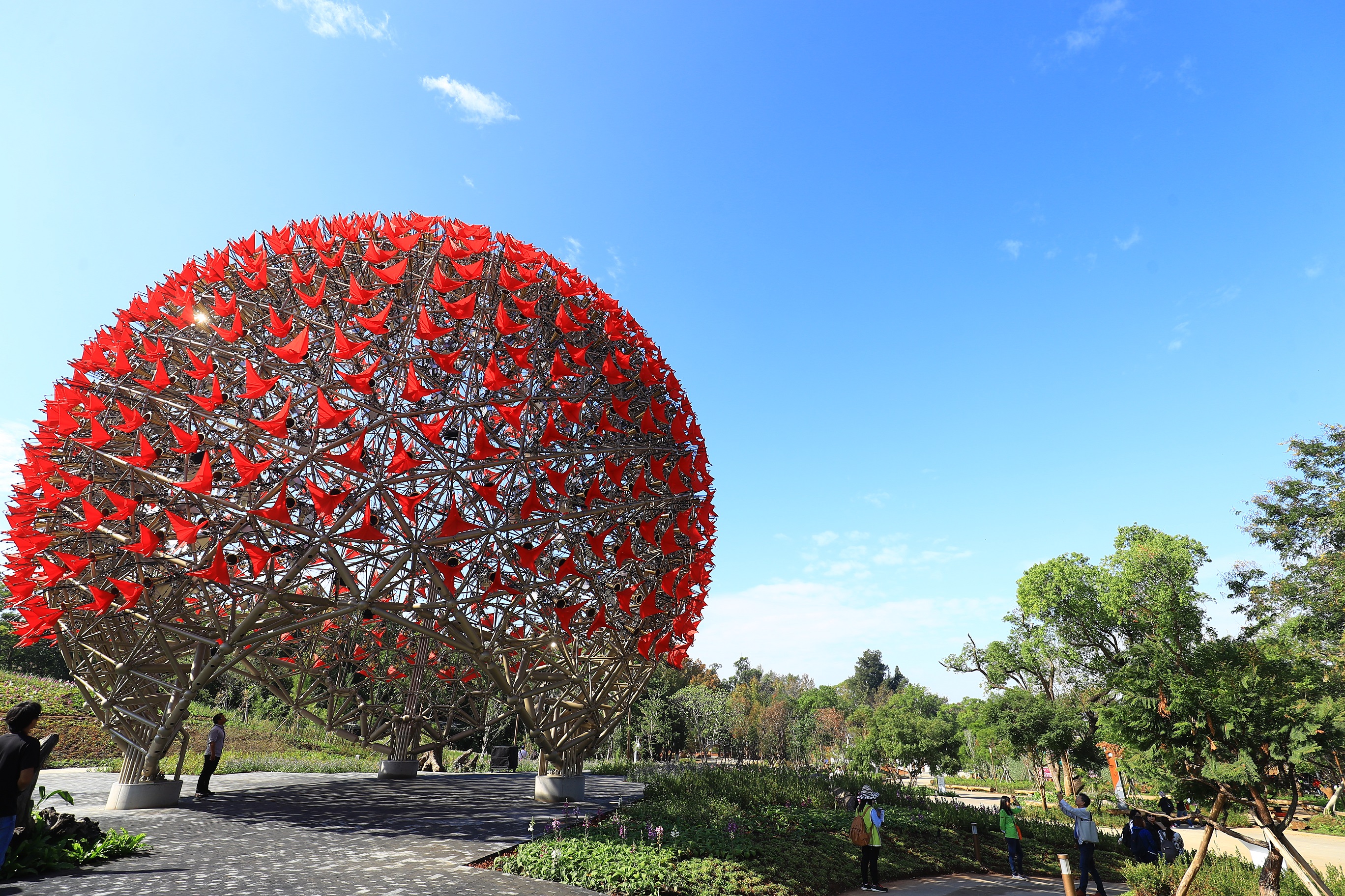 像是位於后里森林園區、高15公尺的的大型裝置藝術「聆聽花開的聲音」,由台北世大運聖火裝置藝術團隊豪華朗機工設計,表面以697朵火紅色「雨傘花」組成,而且還會模擬群花開合的生命、光影和聲音,帶給觀眾視覺、聽覺、感官的生動體驗,可說是這次台中花博的代表性作品,連宏碁創辦人施振榮也對這樣結合藝術、人文與科技的大型裝置十分感興趣;此外,展現坐臥於森林中搖曳生姿的石虎姿態的「森隆活虎館」,則從全台募集4萬多公斤回收瓦楞紙製成2500根回收紙管,打造全球首座回收紙裝置藝術館。