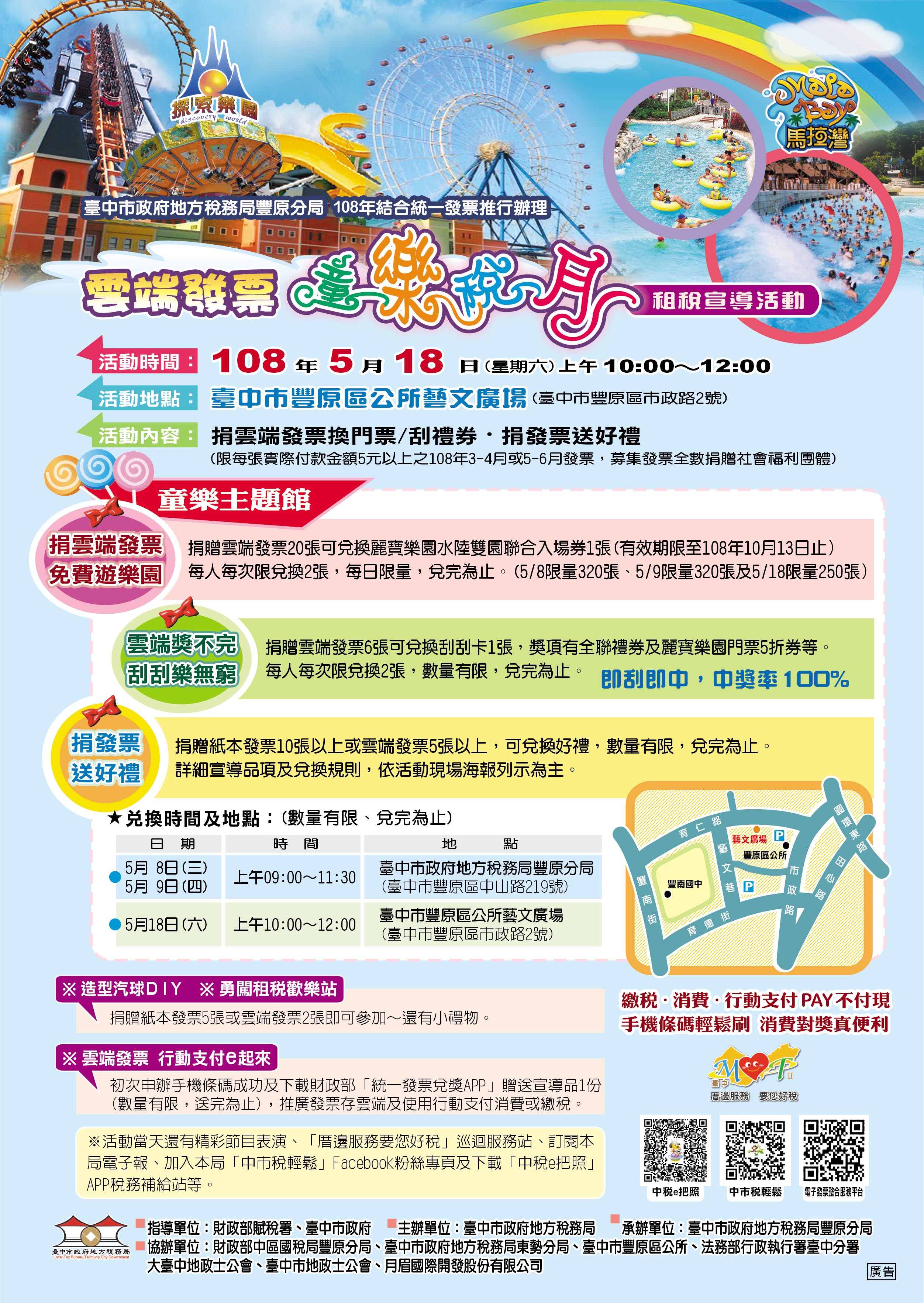 台中市政府地方稅務局豐原分局將於5月18日在台中市豐原區公所藝文廣場舉辦「雲端發票 童樂稅月」租稅宣導活動,民眾捐贈今年3-4月或5-6月雲端發票共20張,即可兌換麗寶樂園水陸雙園聯合票(或於5月8日、9日至豐原分局兌換);捐贈雲端發票6張可兌換刮刮卡1張,中獎率100%,有機會刮中3000元全聯禮券,歡迎踴躍參加。