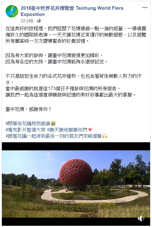花博回顧影片可至「2018臺中世界花卉博覽會 Taichung World Flora Exposition」臉書粉絲專頁觀賞:https://www.facebook.com/1267516983281812/posts/2423892754310890/。