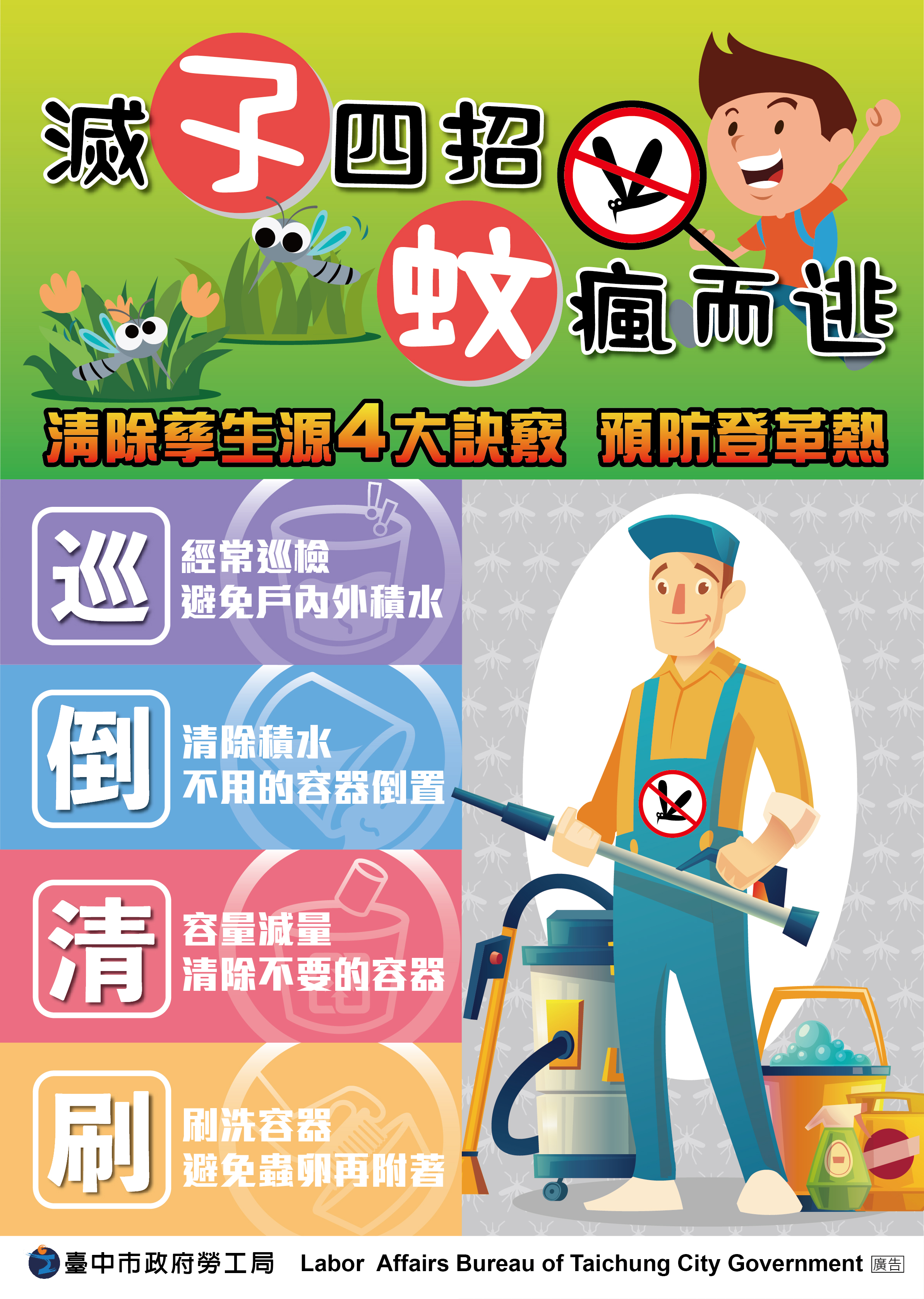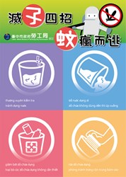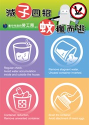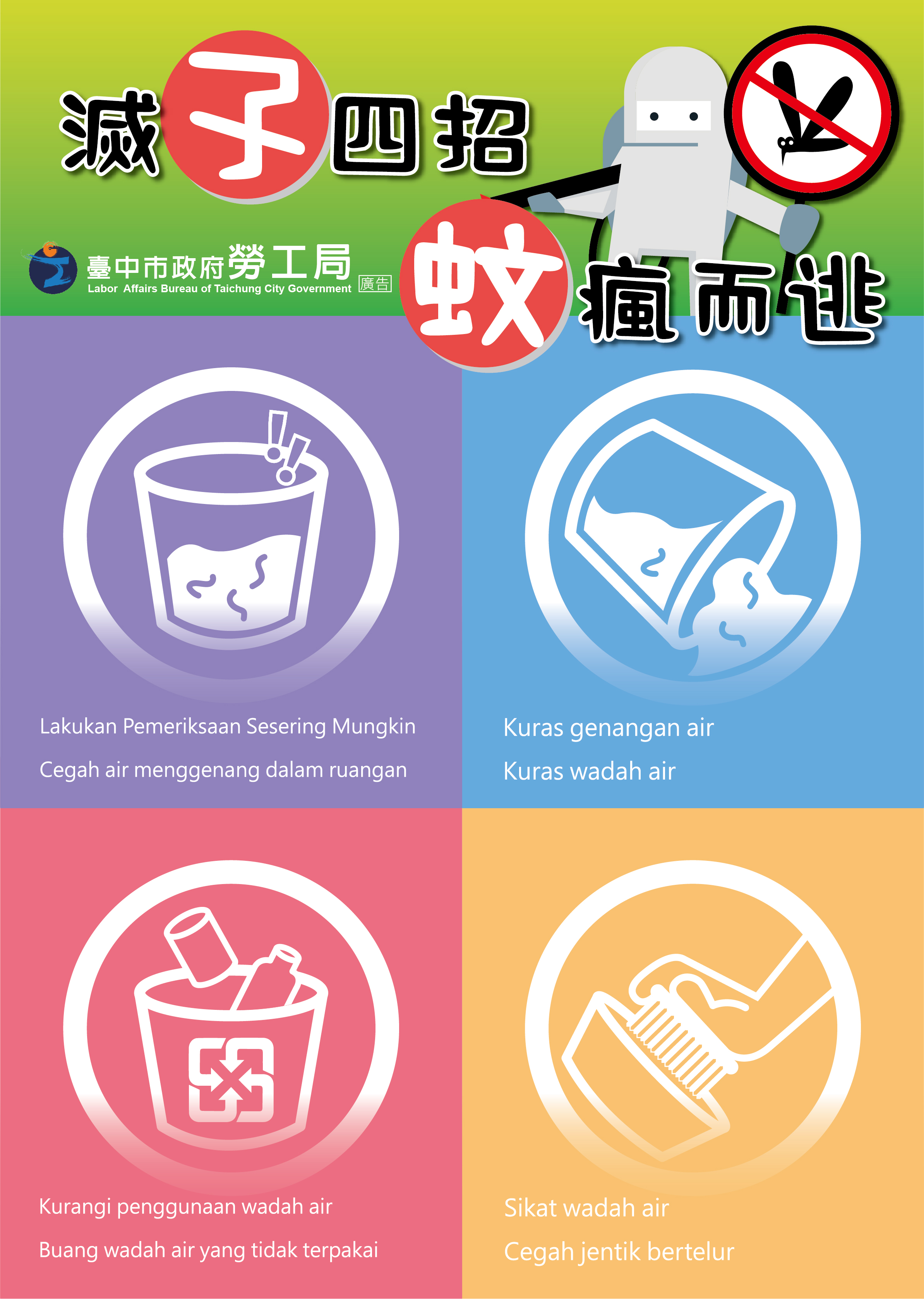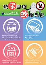 近期東南亞地區登革熱疫情嚴峻,為維護台中市防疫安全,市府各機關均嚴陣以待,其中,勞工局訪視輔導時,宣導雇主及外籍移工加強環境孳生源清除,並巡查戶內外環境避免病媒蚊孳生,並設計中文及四國語言登革熱防疫圖卡,號召民眾勤練「滅孓四招」,落實「巡、倒、清、刷」管理工作,遠離登革熱的威脅。