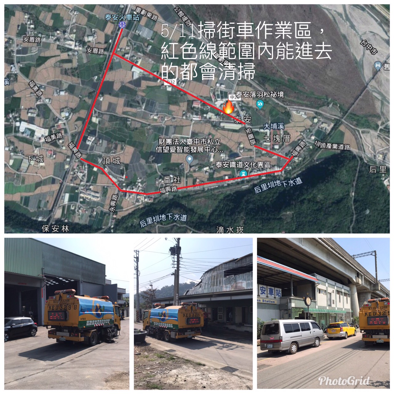 另外,環保局清潔隊自5月9至11日出動2部掃街車及12人次進行火災現場週邊環境維護,包括泰安國小週邊、泰安火車站及安眉路、福興路及福安路等鄰近道路,累積清掃公里數約100公里,希望儘速恢復當地原有的環境。