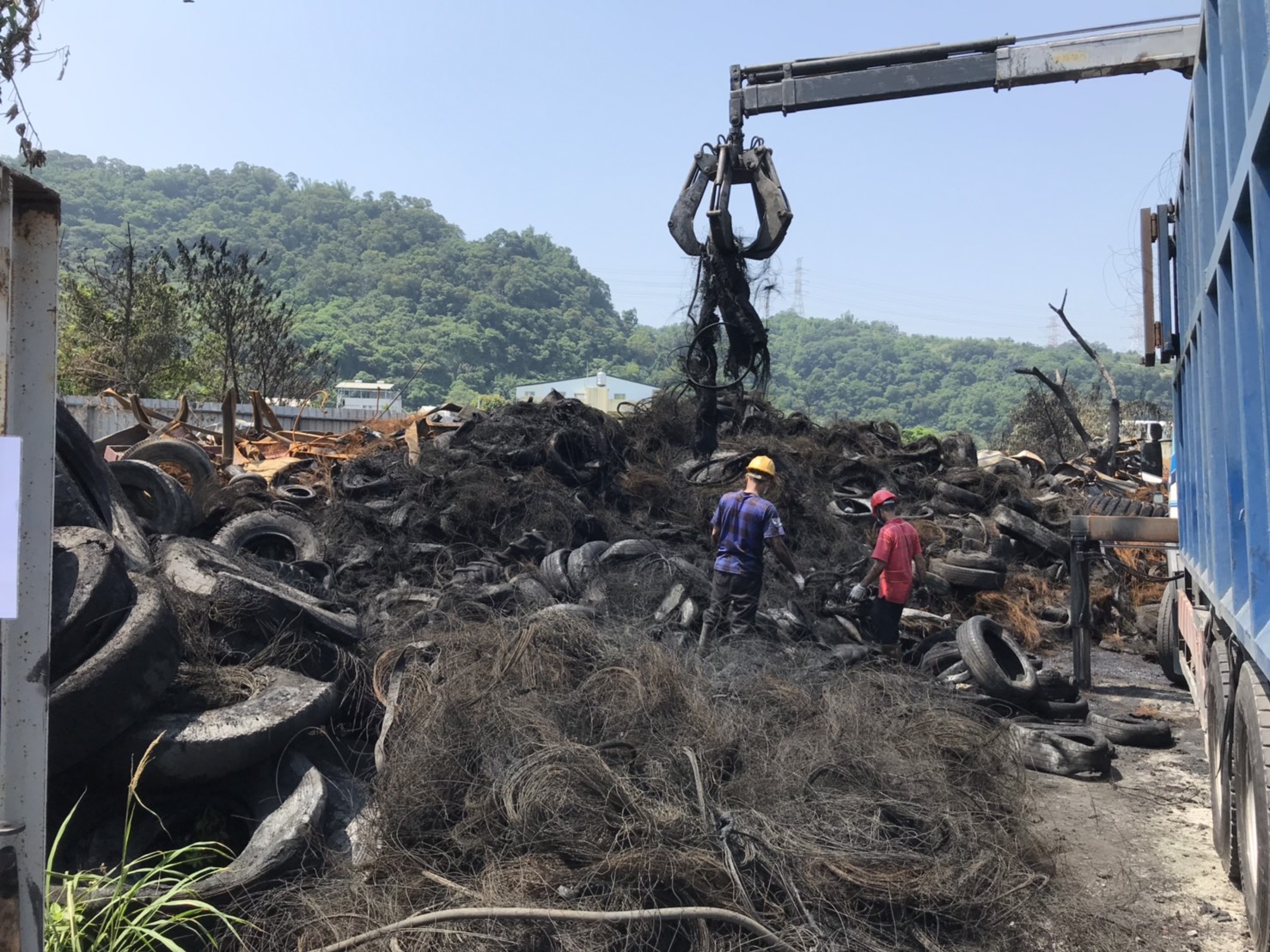 后里區廢輪胎處理廠火災導致環境汙染,台中市政府除已決定祭出500萬元罰鍰並廢止其應回收廢棄物處理業登記證,同時也督促業者做好災後復原清理工作。昨(11)日在環保局的監督下,業者調派兩台抓斗車輛及清除人員清除分類,將約200至300噸廢棄輪胎送往其他合法回收廠處理,清除過程中,環保局特別注意業者降低環境二次污染,以及人員安全。