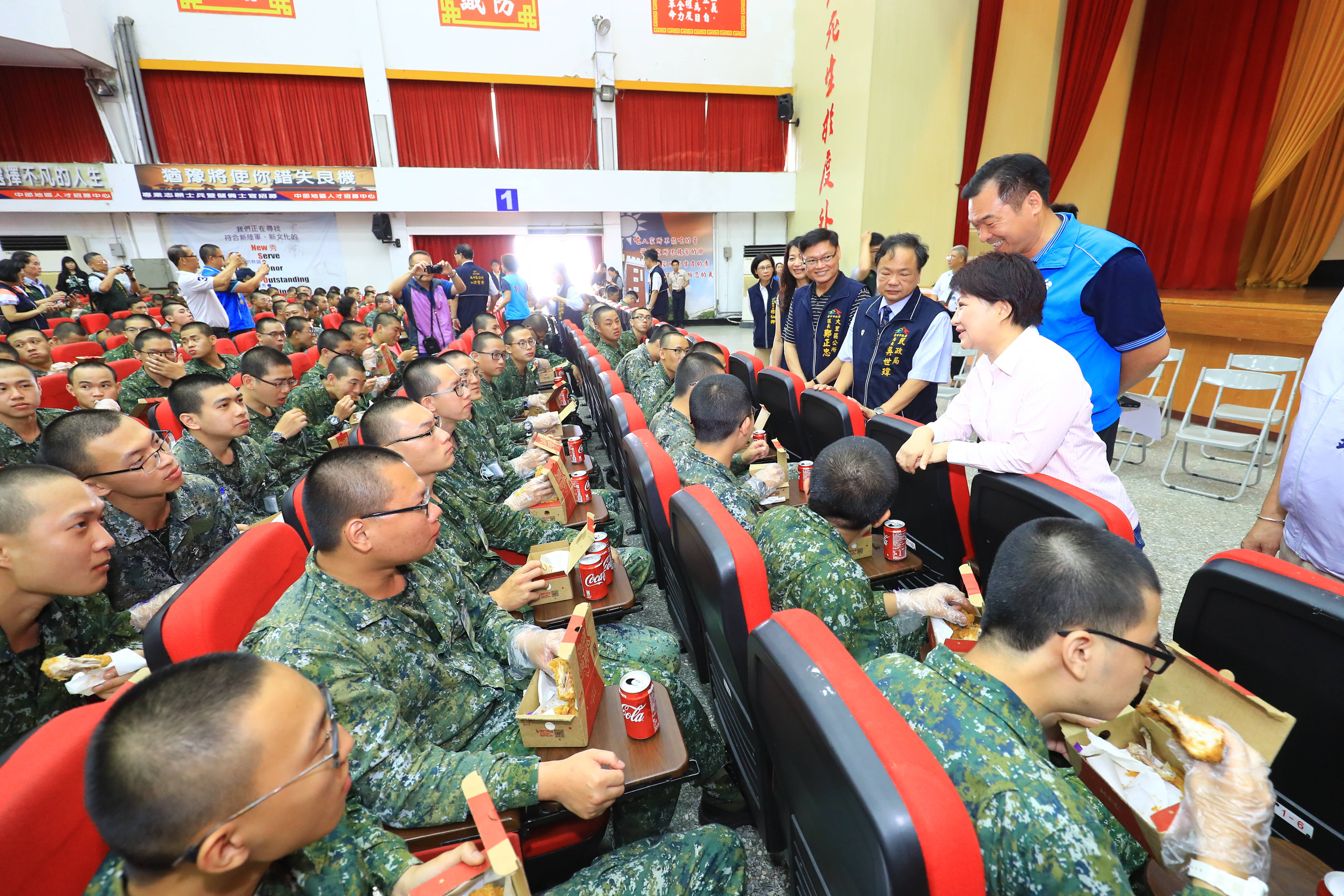 盧市長今日在民政局長吳世瑋陪同下,帶著年輕人喜愛的炸雞和可樂前往成功嶺營區慰勞役男,並與其合影留念,受到役男們熱烈歡迎;盧市長也關心役男們是否會想媽媽?現場有役男說「市長就是我們的媽媽」,讓她直呼「再多送一盒炸雞」,氣氛歡樂。