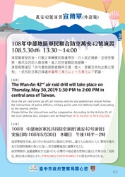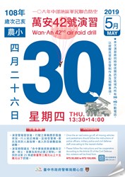 台中市政府警察局呼籲,5月30日下午1時30分至2時舉行萬安42號演習,將實施30分鐘防情傳遞、警報發放、人車疏散、交通管制及戰災救護等演練,人、車一律按規定接受警察及民防人員指導,進行防空疏散避難,居家者應緊閉門窗及實施燈火管制。