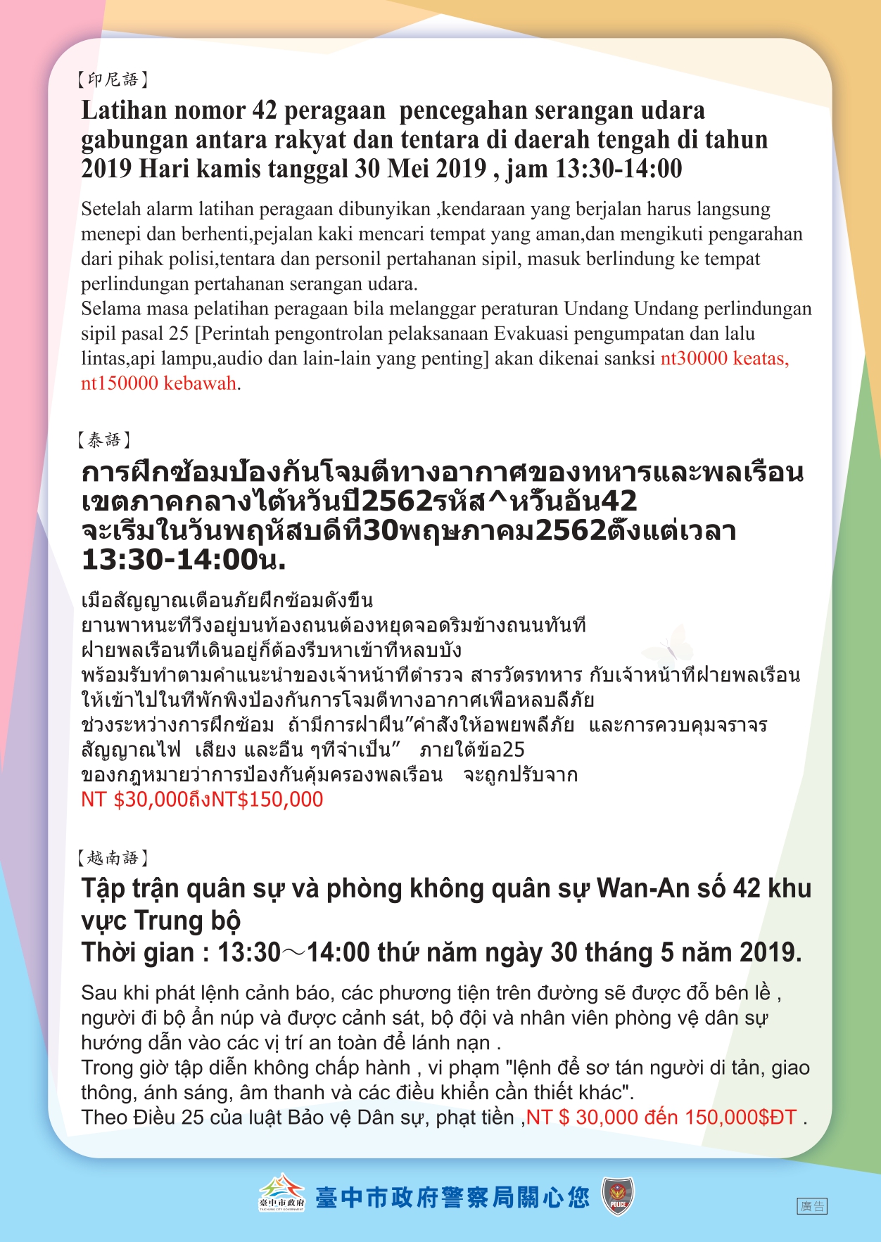 警察局表示,為加強宣導演習事項,除於公共場所張貼宣傳海報及向民眾發送宣傳單外,今年特別製作並發送英語、日語、越南語、印尼語及泰語等5國語言宣導單且置於警察局官網宣導,呼籲在外籍人士配合管制。(5/17*18)*警察局