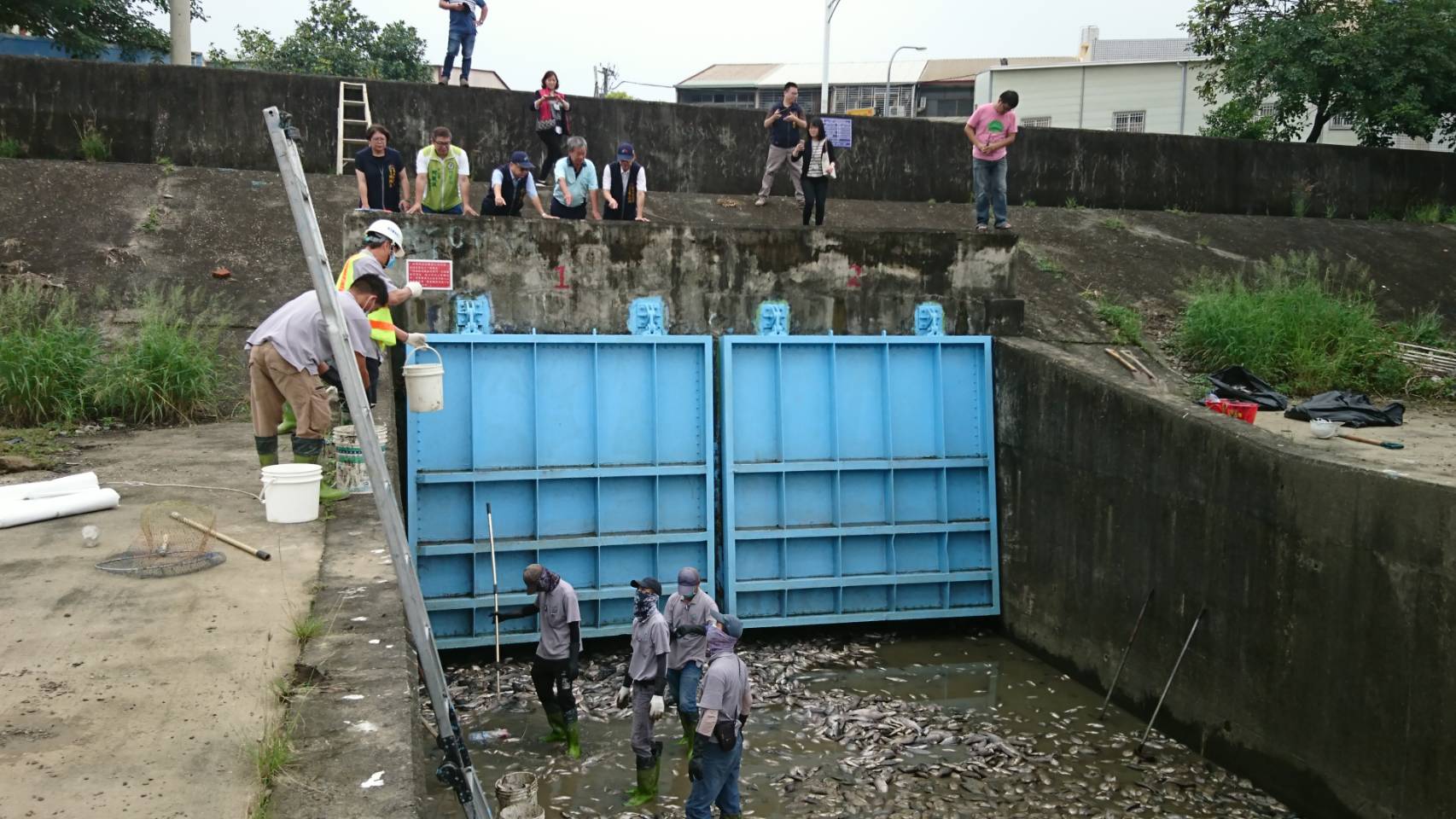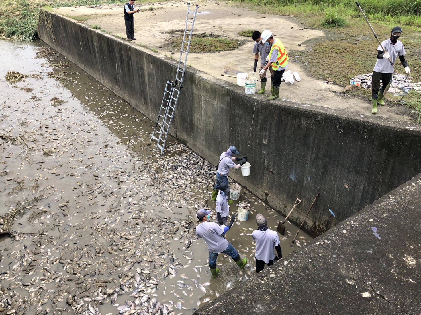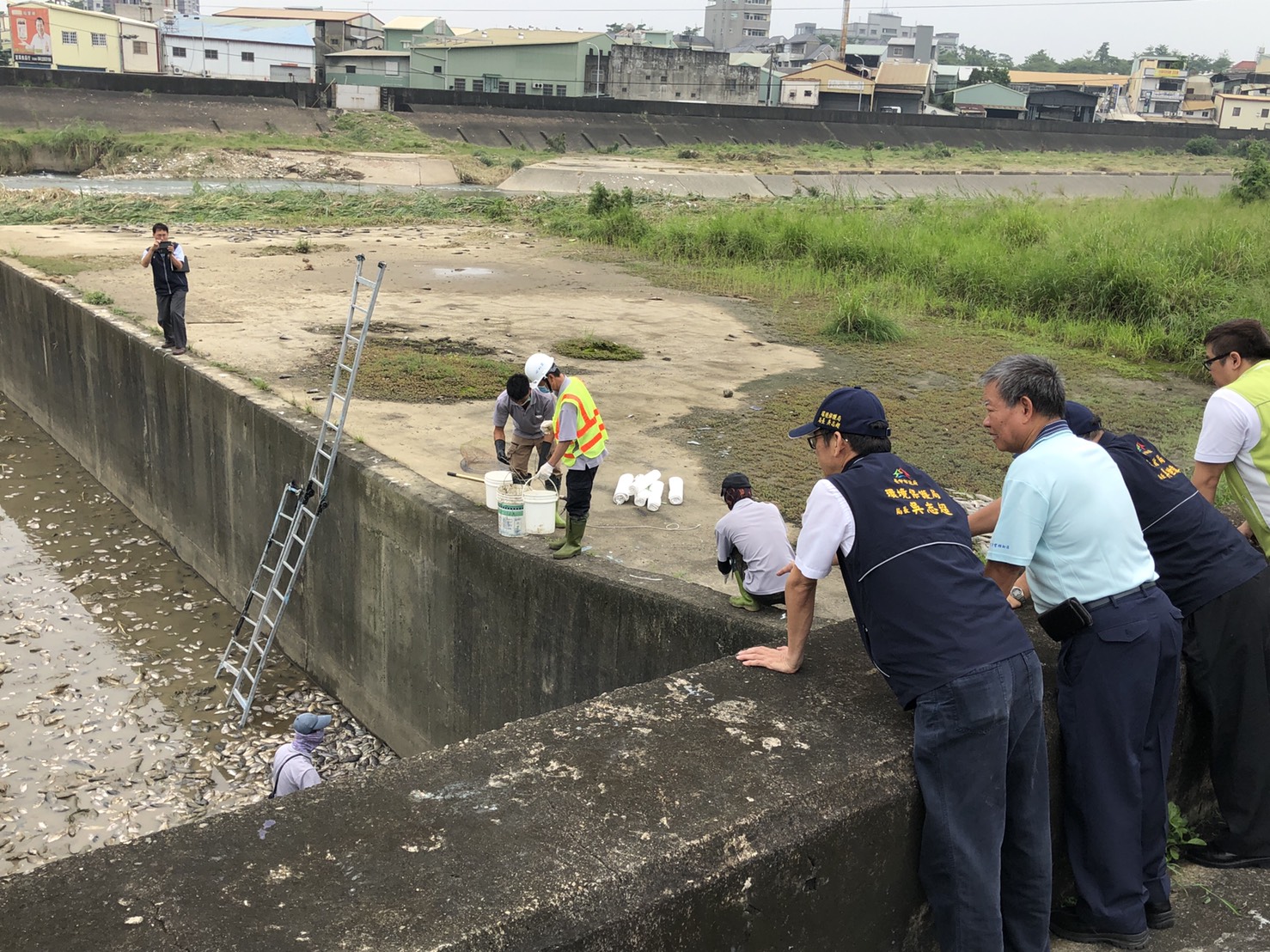 市府環保局長吳志超、民政局長吳世瑋、東區公所區長陳佩玉等人今(22)日至旱溪勘查死魚情形,現場經濟部水利署第三河川局出動30人、市府環保局出動30人、垃圾車2輛、清溝車1輛,共同執行旱溪沿線死魚清理工作。