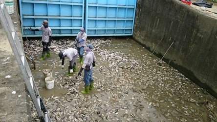 河川管理單位經濟部水利署第三河川局昨日開始即持續積極清理,但因死魚數量多,為加速清理作業,環保局也調派轄區清潔隊同仁協助相關工作,清理完成的魚屍將由轄區清潔隊載運至焚化廠焚化。(5/22*13)*環境保護局