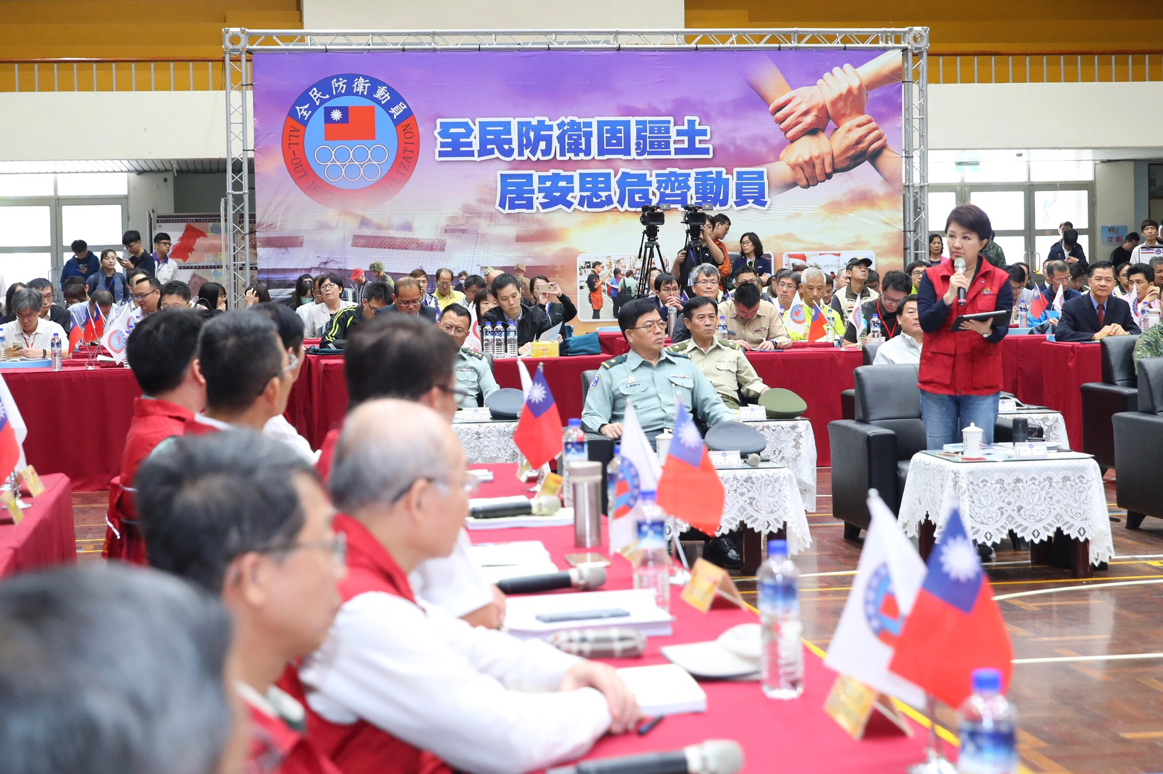 今日演習區分為「兵棋推演」、「綜合實作」二階段實施,由盧市長擔任召集人,率市府多位局處首長和各區區長參與上午兵推演練,包括國防部常務次長蕭維民中將、行政院動員會報副執行秘書羅籝洋少將、後備指揮部副指揮官程幼銘少將、市議員尤碧鈴、陳廷秀等人都到場見證成果,並為參演人員加油。
