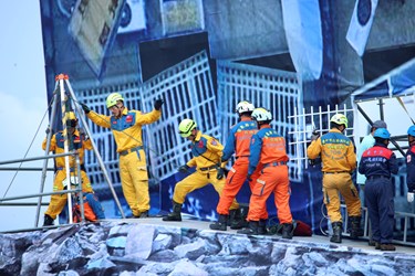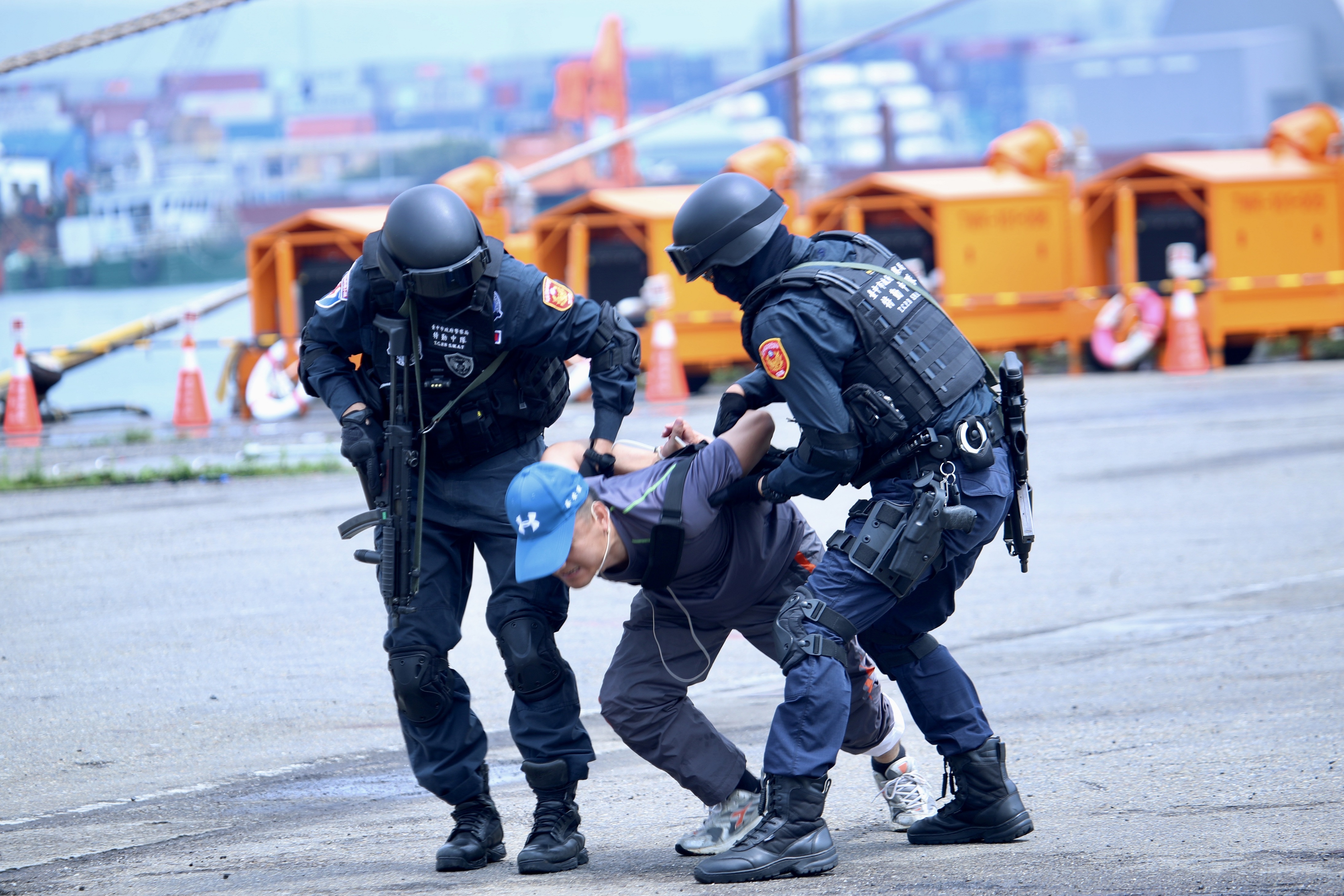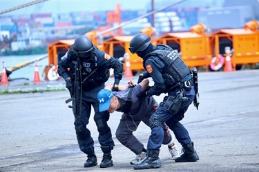 下午在台中港第3、4號碼頭及台中區漁會舉辦實兵演練驗證防災整備成效,進行反恐演練及23個災害防救假設狀況,針對去年國道大甲段油罐車火警案例,首度使用自走式遙控消防砲塔(消防履帶車)參與毒性化學物質災害搶救狀況,由消防履帶車代替消防人員深入具高度危險性的火災現場,降低消防同仁深入現場救災風險。
