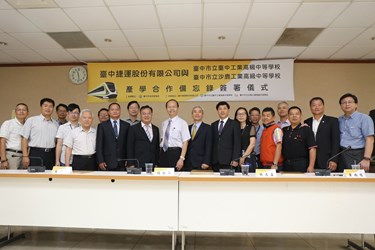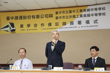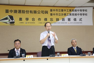 今日在教育局長楊振昇見證下,台中捷運公司董事長林志盈與台中高工校長黃維賢、沙鹿高工校長黃尚煜等人,共同簽署合作備忘錄。