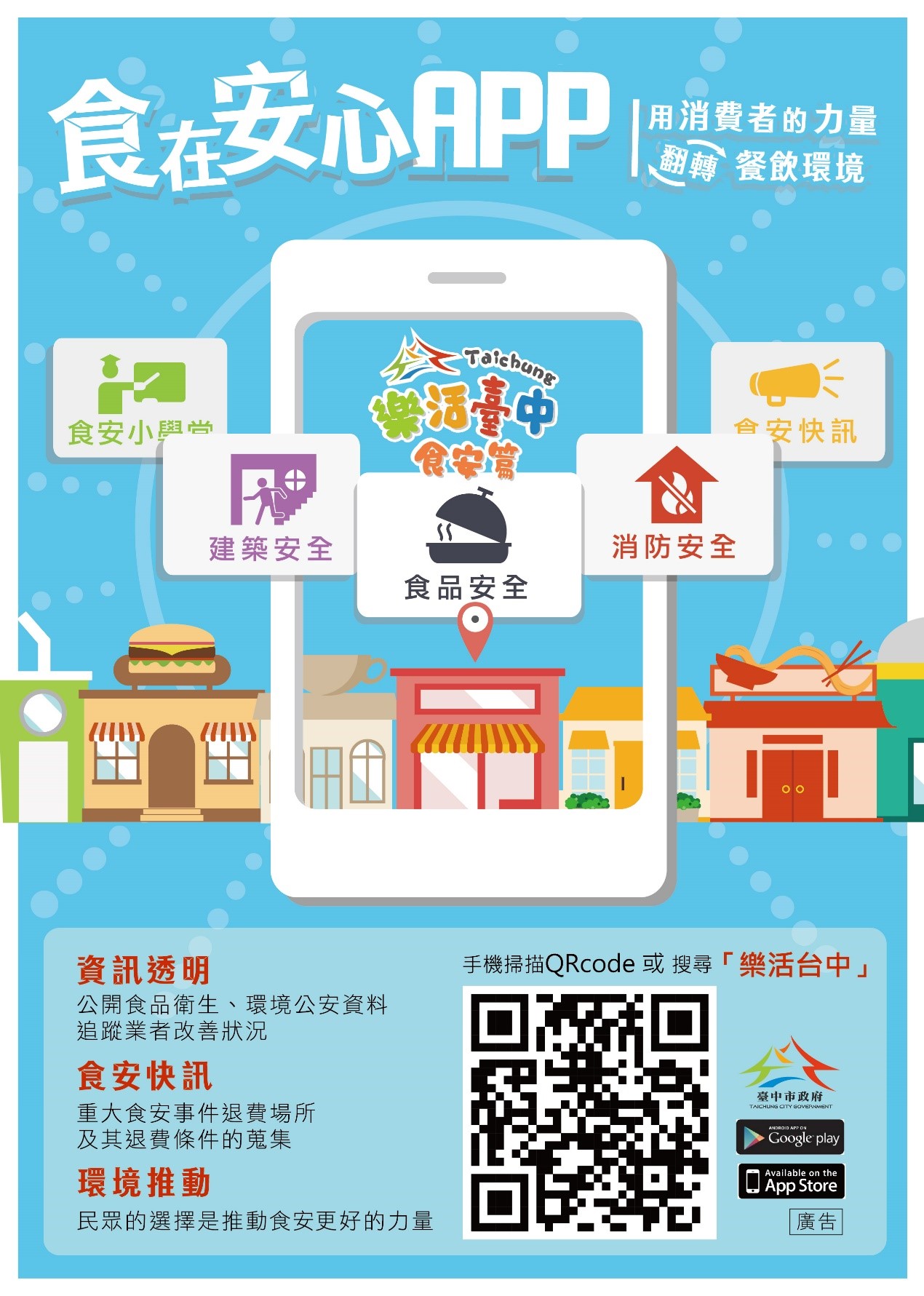 台中市政府今年暑假7月10日到8月18日期間推出「台中購物節」,只要到台中市特約商家消費滿5百元即可登錄抽千萬豪宅、汽車等大獎。法制局為營造友善消費環境及保障飲食安全,鼓勵民眾多利用「樂活台中」APP,可查詢台中市大型餐飲業者稽查資料,檢視食品、消防及建築等方面的安全資訊,方便選擇優質的場所消費。