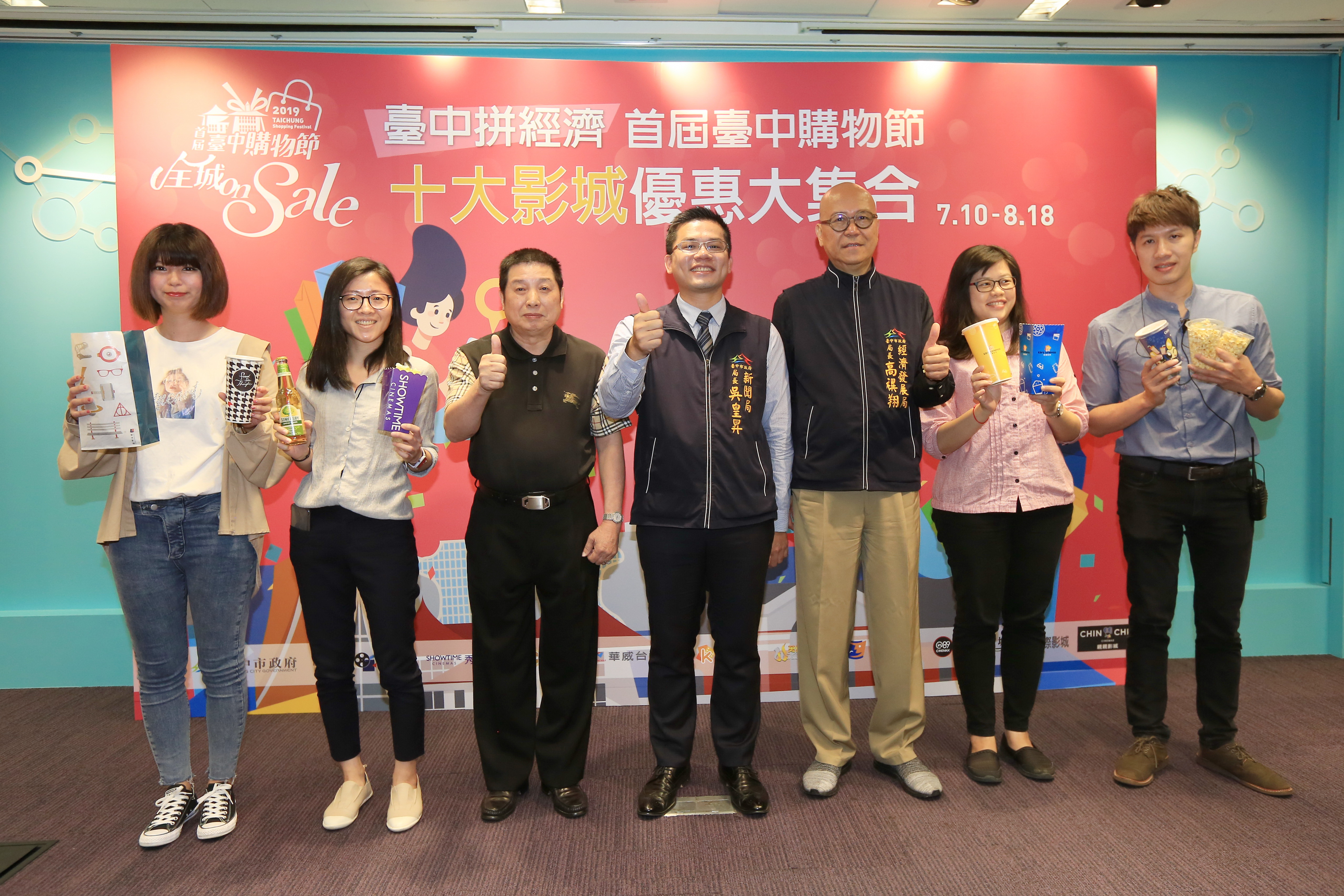 今(29)日台中購物節十家影城優惠大集合記者會,包括新聞局長吳皇昇、經濟發展局長高禩翔、台中市電影戲劇商業同業公會理事長王光輝、萬代福影城董事長黃炳熙、華威台中影城營運經理張靜文、新光影城店經理林詩雯、凱擘影城經理謝桓縉、商品經理孫峻書、台中文心秀泰影城副理蘇育民、台中站前秀泰影城副理林傑恩、豐原in89豪華影城行銷總監陳惟智等人與會,介紹這次活動的好康優惠內容。