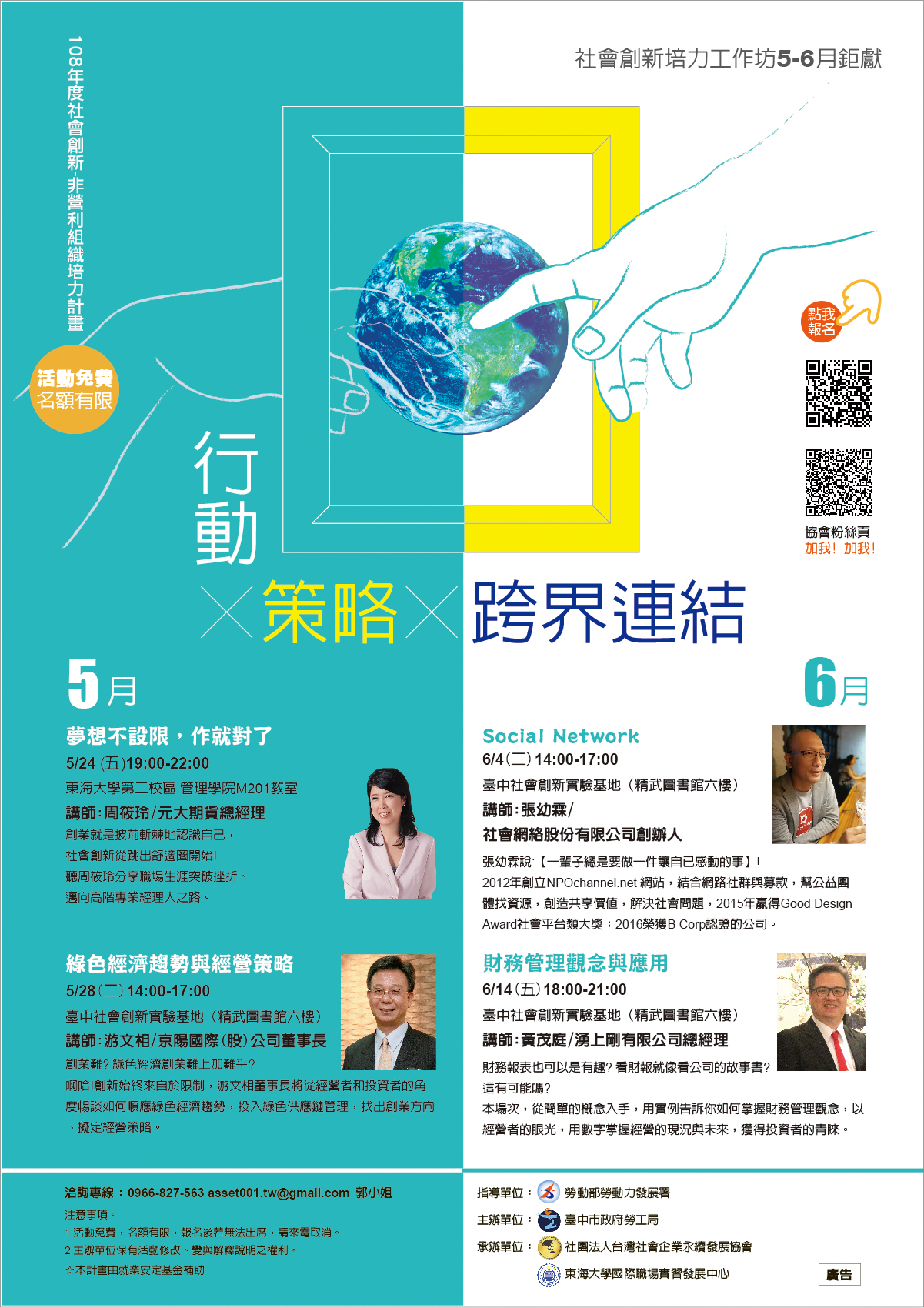 為鼓勵青年投入社會創新事務,市府勞工局推動「社會創新-非營利組織培力計畫」,舉辦12場免費培力工作坊、2場社會創新參訪體驗、實習生媒合、專家創業輔導、商品媒合會,以創意解決社會問題,歡迎踴躍報名。
