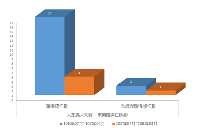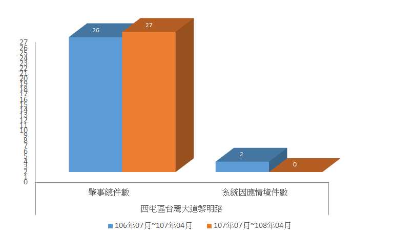 設置路口肇事次數以106年7月至107年4月比較107年7月至108年4月,西屯區台灣大道與黎明路口由2件減至0件,大里區大明路、東興路與仁興街由2件減至1件,初步檢視適用情境事故件數下降。而107年期計畫因建置時間尚短,可供統計分析的樣本數少,故目前尚處於績效分析階段。