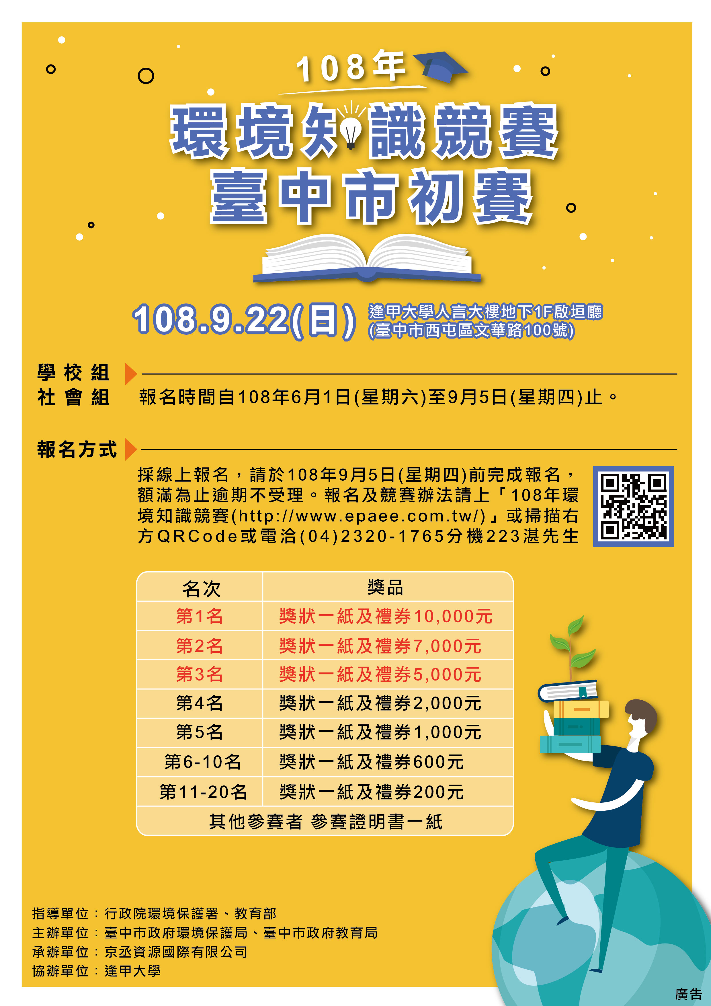 環保局表示,台中市政府環保局與教育局共同主辦108年環境知識競賽台中市初賽,此次競賽活動報名時間為6月1日至9月5日,依參賽資格分國小、國中、高中(職)及社會共四組,每組依報名先後依序受理。
