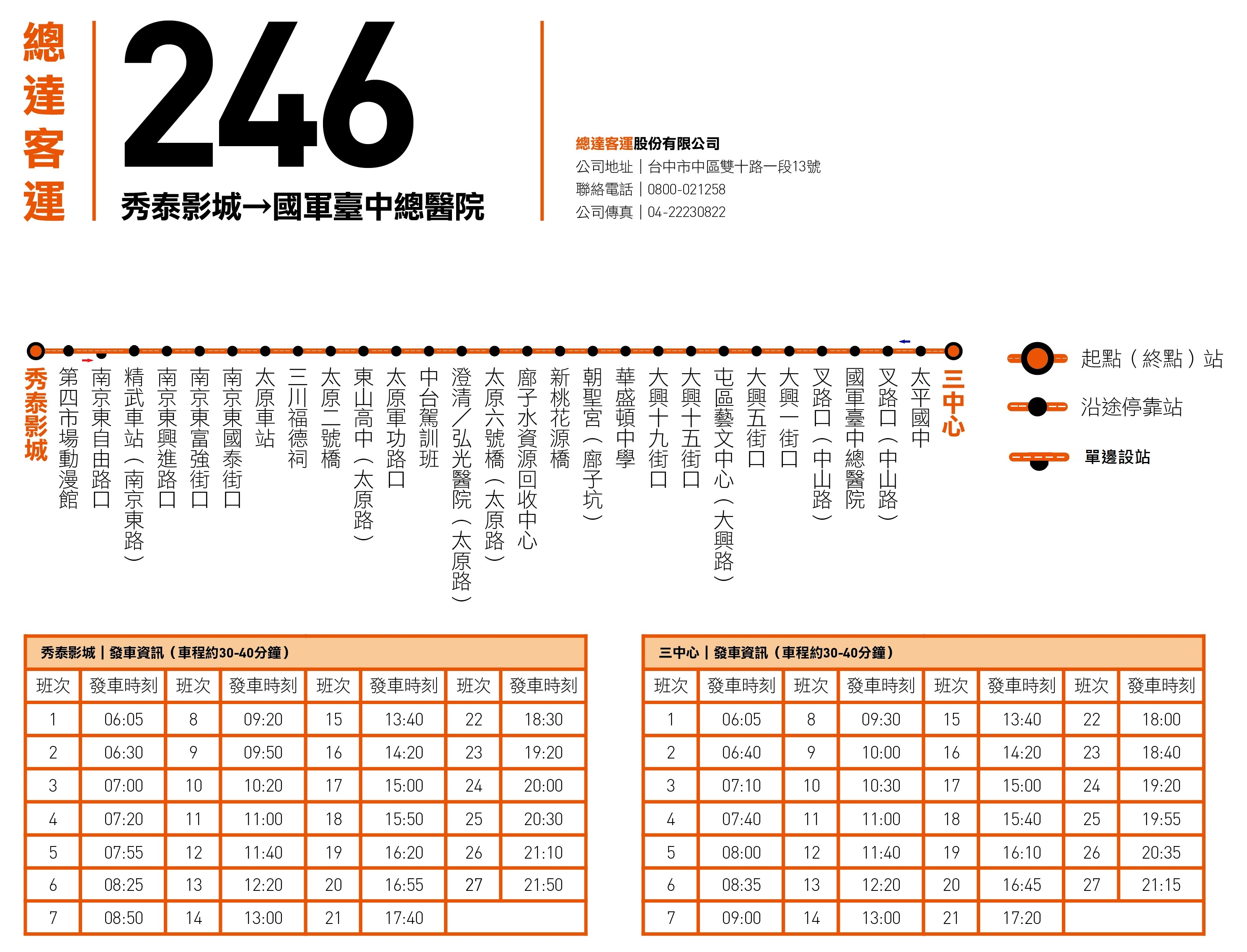 為強化鐵路高架化沿線車站聯外交通及擴大公車服務範圍,台中市政府交通局持續盤點各車站聯外交通服務狀況,協調總達客運246路公車今(1)日起由太原車站延駛南京東路、南京路至秀泰影城,路線行經北、東區並串聯太原及精武車站,便利轉乘火車,也解決過去南京東路、南京路周邊居民,須步行數百公尺才能搭公車的困擾。
