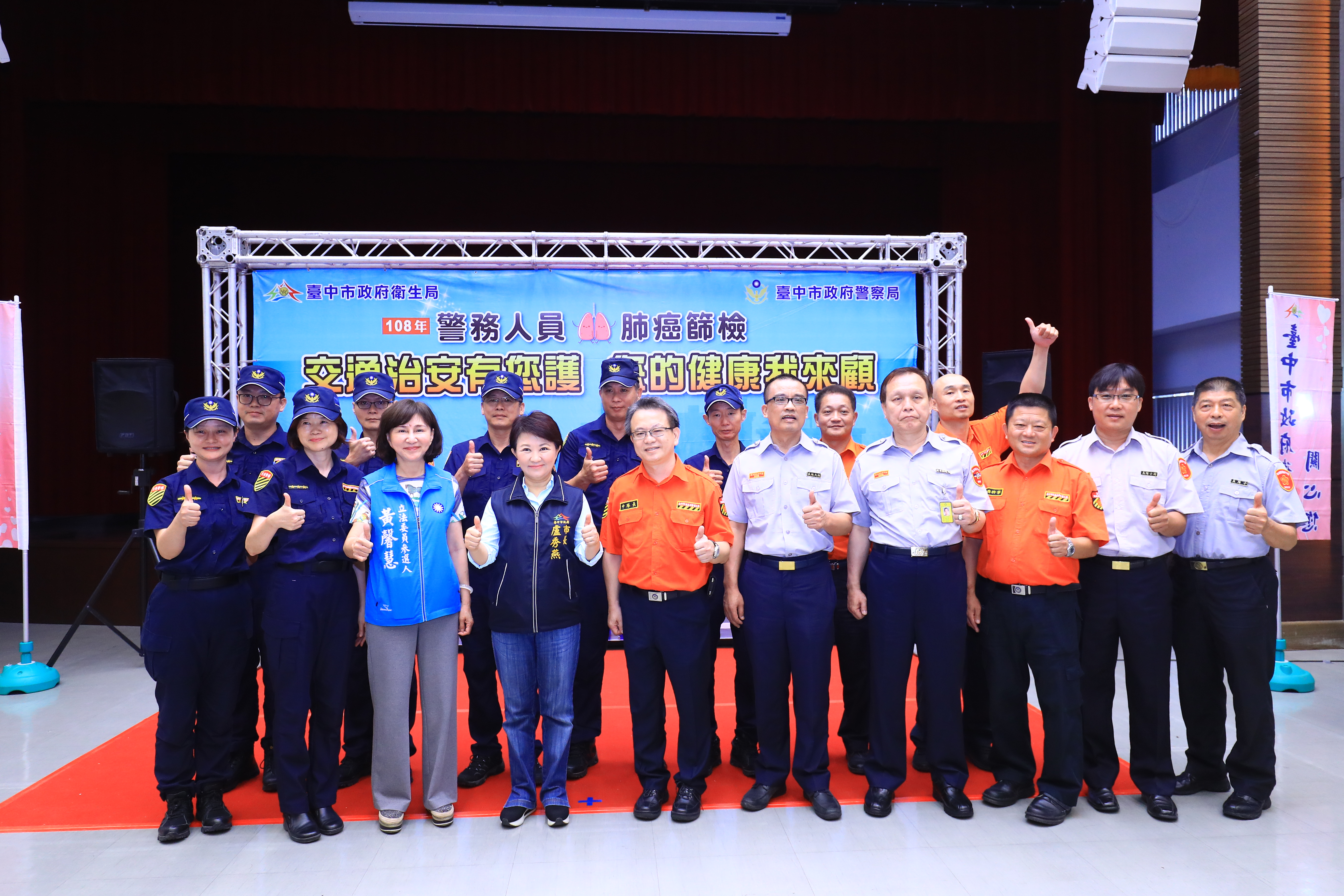 台中市政府全國首創,針對交警、義交、義警、民防等高風險警務人員,結合15家醫院提供2200個肺癌篩檢公益名額,只要符合條件均可免費篩檢,感謝警務人員辛勤維護治安及交通。市長盧秀燕感謝醫療院所響應市府政策,提供公益篩檢名額,明年起市府也將逐年編列相關預算,早期發現,早期治療。