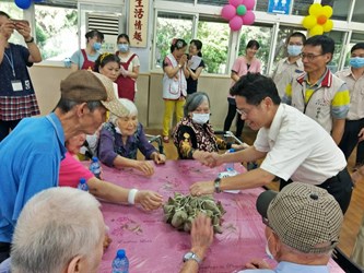 市府社會局長李允傑、市議員沈佑蓮等人共同出席與長輩同樂,並一桌一桌將粽子送到每位長輩手中,希望讓長輩感受端午節氣氛,重溫美好回憶。