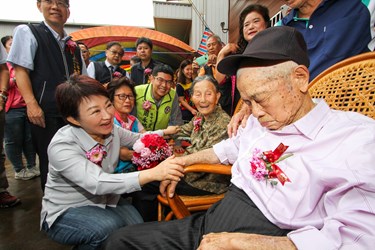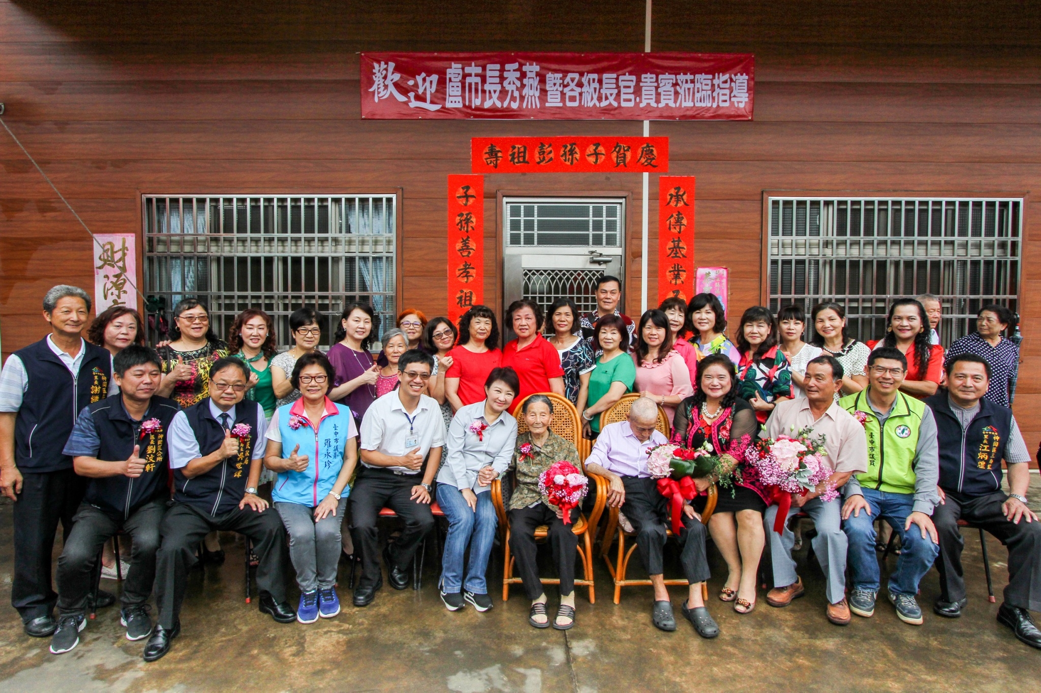 台中市神岡區一對百歲老夫婦林益縣、林田連妹結縭80年,市長盧秀燕今(4)日特別前往老夫婦家中拜訪祝福並致贈禮品。盧市長表示,兩位長輩的高壽令人佩服,夫妻攜手走過80載更難能可貴,祝福兩位長輩結婚周年快樂,也希望兩人雙雙對對、萬年富貴。