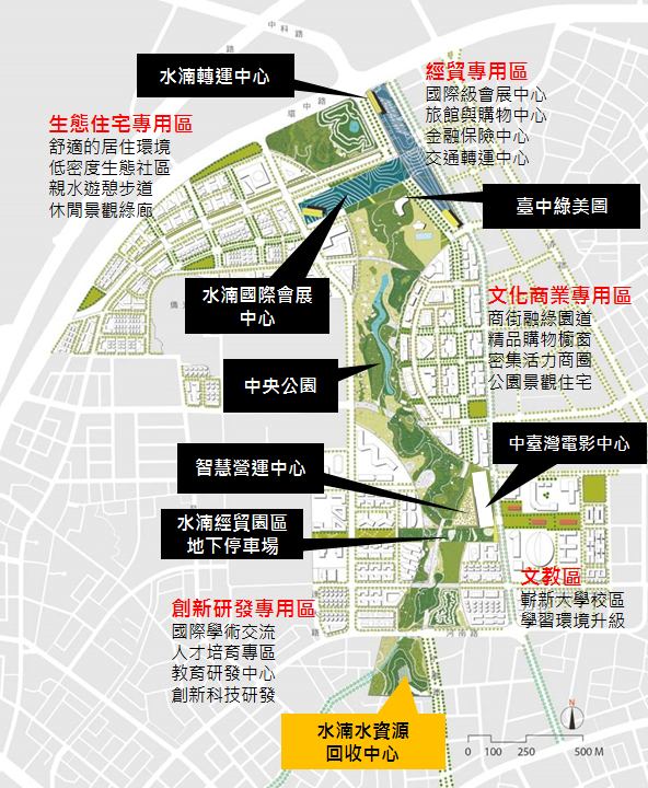 水利局表示,水湳經貿園區為國內都市社區中佈設中水道系統首例,未來水湳水資源回收中心可將每日近1.8萬噸的生活汙水,處理後轉化為可利用但非飲用的中水,當中4千噸透過中水道提供水湳經貿園區內的公共場館及未來園區內建物作為沖廁及澆灌使用,並透過智慧管網監控系統控管供水量。