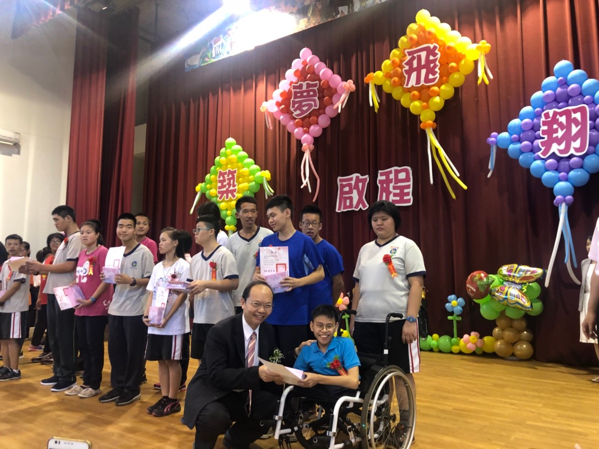 此外,畢業生潘姓同學雖因先天脊椎變形彎曲,影響身高僅75公分,並伴隨多重障礙,卻能超越先天缺陷,熱愛學習並能自理生活,還苦練陶笛,用毅力考取4張街頭藝人證照,榮獲今年度總統教育獎肯定,非常難能可貴。