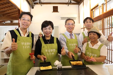 楊副市長也在參觀「不老食光」餐廳後,與高齡71歲的不老料理人陳美月等人一起製作玉子燒,她表示,「不老夢想125號」結合文化資產、社會福利及不老食光餐廳,除可推展台中市長公館之美,更能結合銀髮族長輩快樂生活的一面,歡迎所有民眾前來參觀並享用美食,也能學習如何照顧長輩。