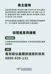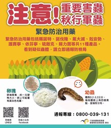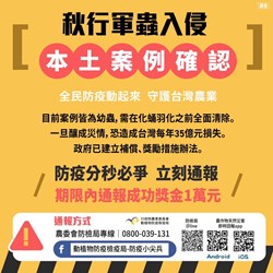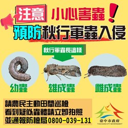 此外,市府也將透過民政系統加強宣導秋行軍蟲辨識及通報,請民眾提高警覺、主動通報;如有疫情發生,市府除落實防制措施外,也將儘速辦理補償金發放及後續所需農業資材補助措施,全力協助。