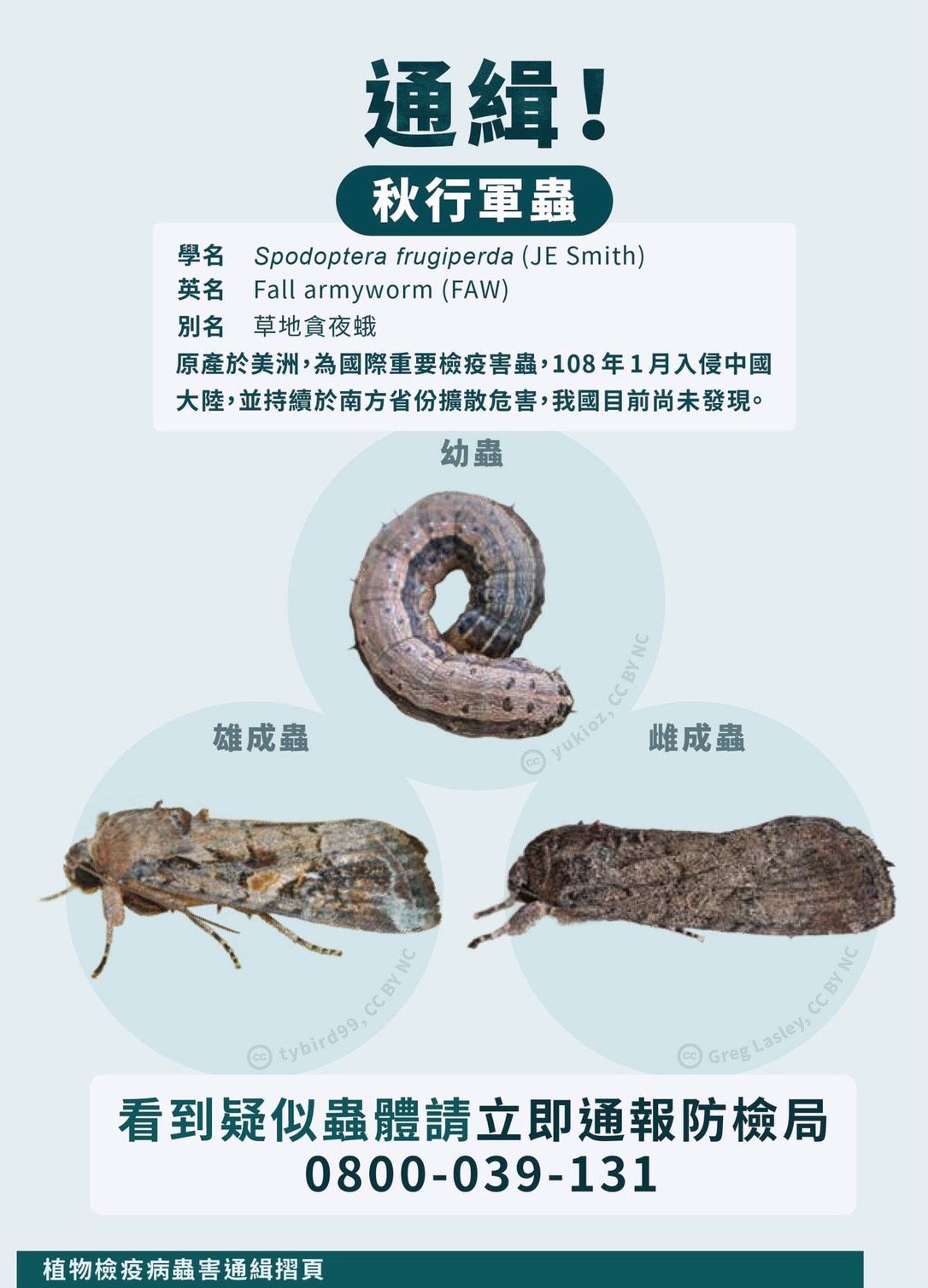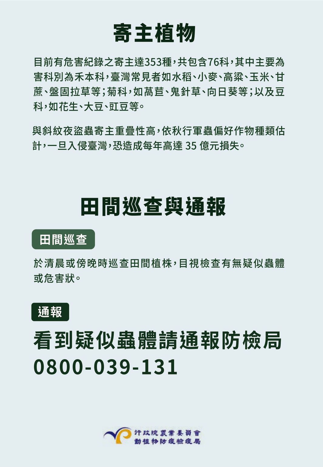 民眾如發現疑似蟲體,請撥打防檢局通報專線0800-039-131,或通報農委會所屬各地區農業改良場所、「農作物天然災害即時回報」APP,也可撥打台中市1999為民服務專線,以利市府及早處理。(6/14*13)*農業局
