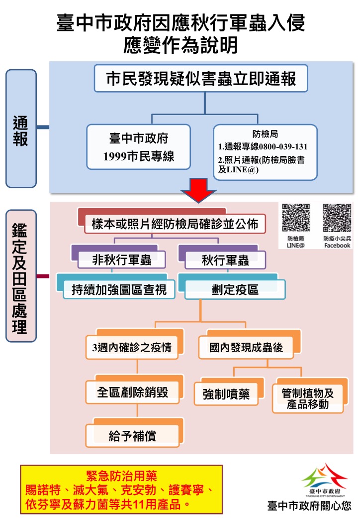 農業局指出,秋行軍蟲監控處理小組將巡查轄區,掌握害蟲發生狀況,若發現害蟲則啟動緊急防疫措施,針對發生地區界定面積設置封鎖線進行管制,並進行現地焚化或現地掩埋銷毀。