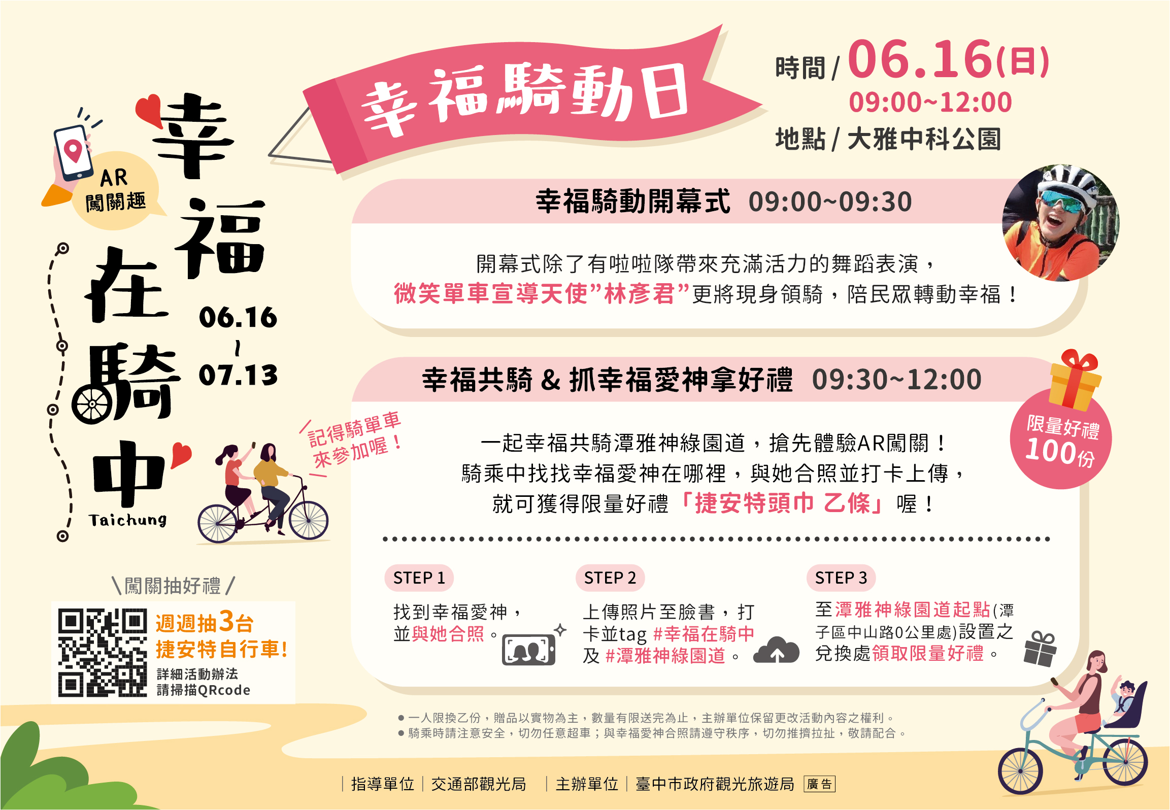 「幸福在騎中-自行車道行銷推廣活動」6月16日起至7月13日,分別於潭雅神綠園道、濱海自行車道(高美濕地)、136線自行車道舉辦,觀旅局表示,從壯麗山景、蔚藍濱海到市區近郊綠地,三條自行車路線能將台中山海美景盡收眼底,無論是親子共騎、專業車友、情侶約騎,希望透過自行車道AR擴增實境闖關活動,讓幸福在騎中成為春遊台中最美好的回憶。