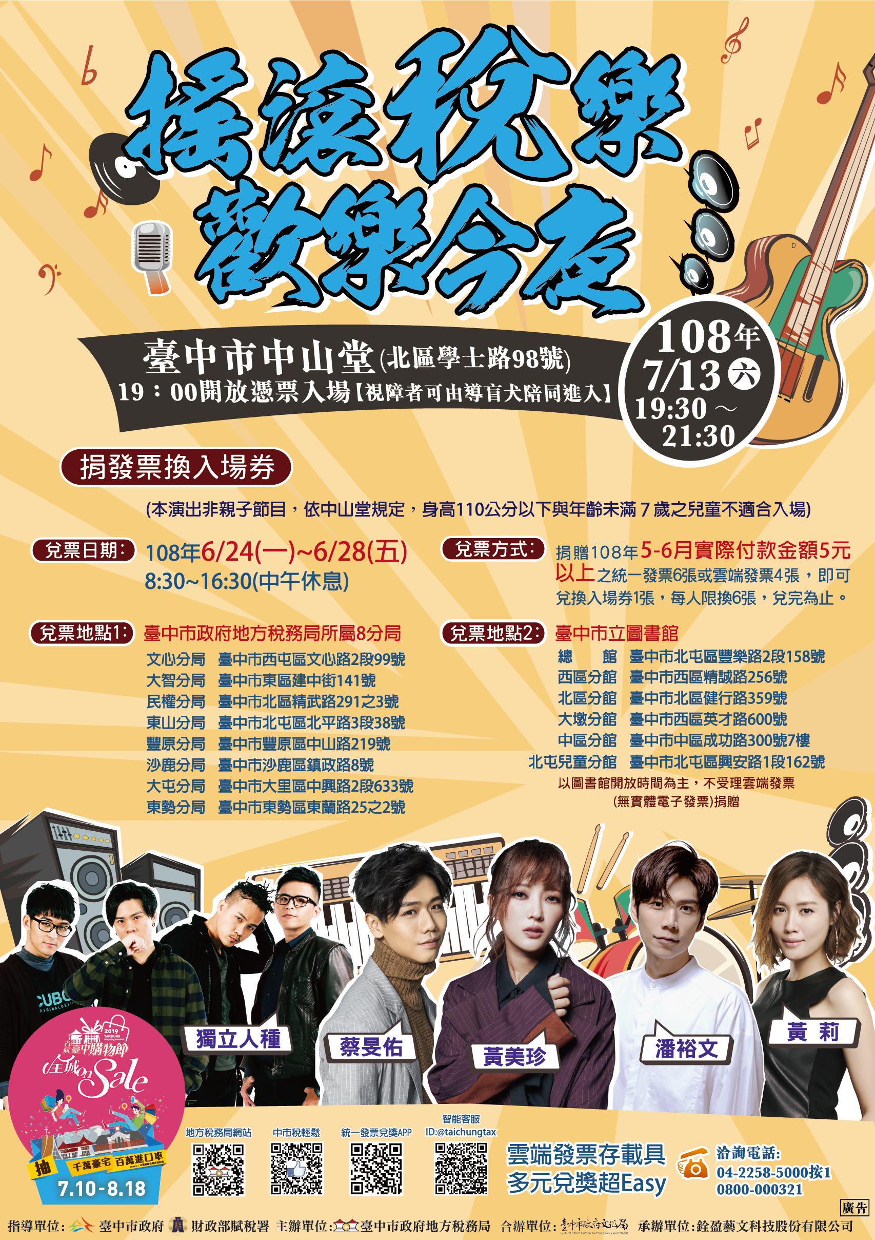 台中市政府地方稅務局將於7月13日晚上7時30分在台中市中山堂舉辦「搖滾稅樂 歡樂今夜」演唱會,邀請歌手潘裕文、黃莉、蔡旻佑、黃美珍及台中在地樂團獨立人種同台演唱。6月24日起至28日止,至稅務局各分局、市立圖書館總館及分館,捐贈今年5月至6月實體發票6張或雲端發票4張,即可兌換入場券;此外,台中購物節將於7月10日登場,稅務局歡迎演唱會後,轉往附近商圈消費,累計滿500元即可參加千萬豪宅、名車等抽獎。