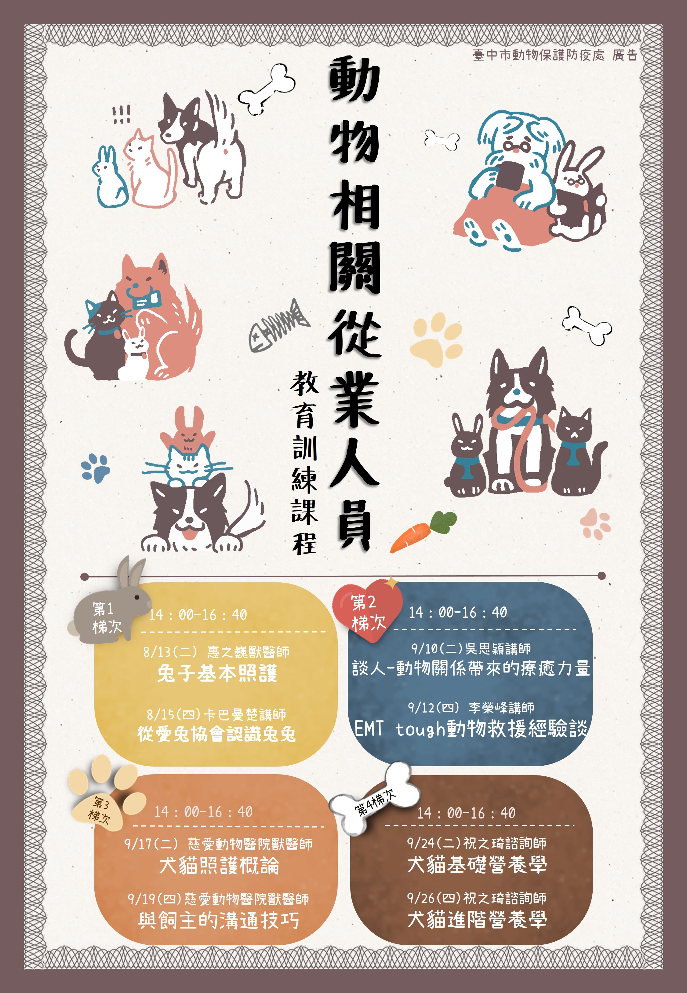 台中市動物保護防疫處持續推廣愛護動物觀念,為讓動物相關從業人員能將動保理念落實工作中,8月13日起將舉辦4梯次「動物相關從業人員教育訓練課程」,課程內容包括兔子基本照護、療癒犬、動物救援經驗、犬貓照護、與飼主的溝通技巧、犬貓營養學等,即日起至8月1日開放報名,每梯次限80名,額滿為止。