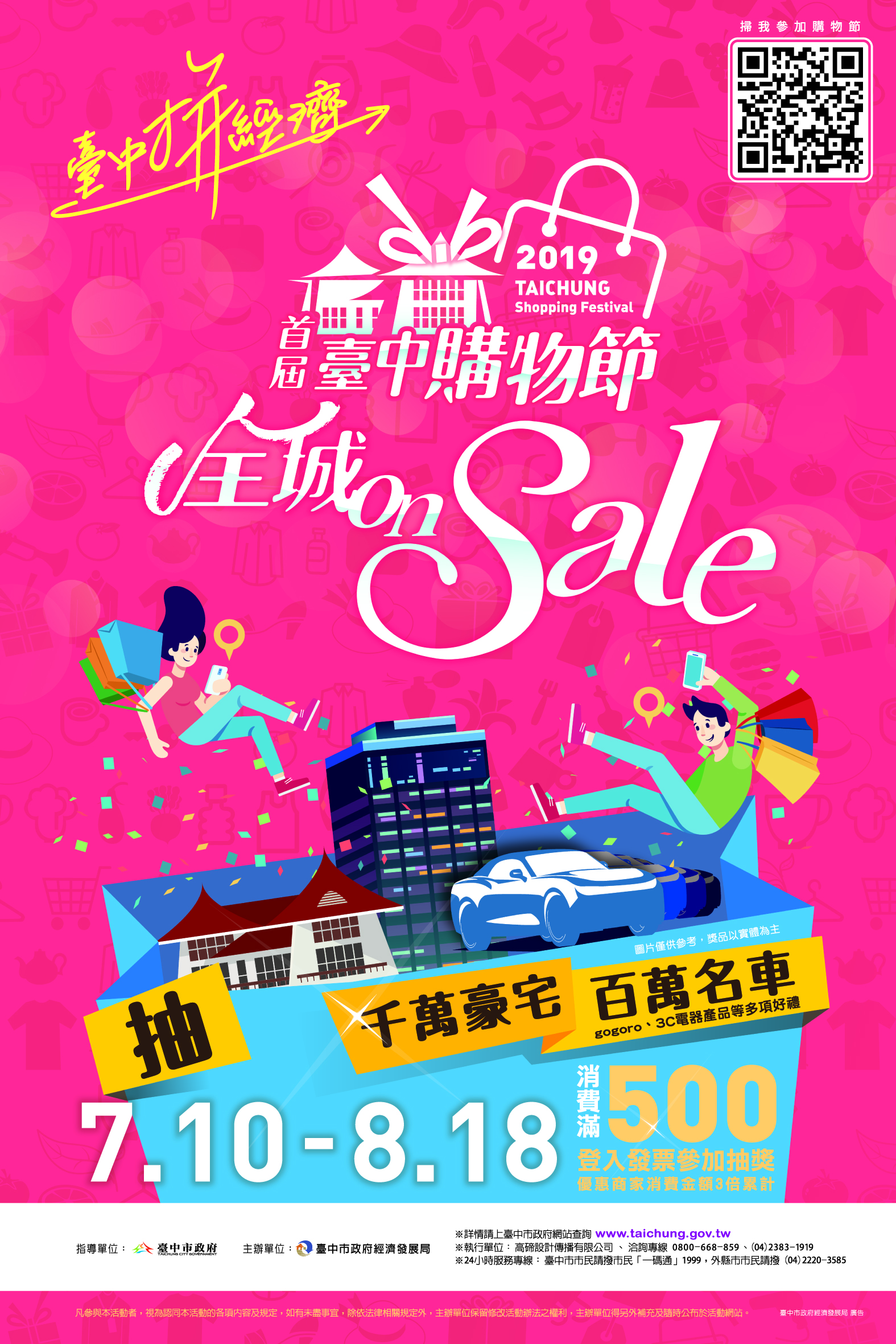 交通局指出,台中購物節期間週週抽好禮,週週送大獎,民眾只要在台中市任一店家消費累計滿500元,上網登錄發票就可參加抽獎,有機會抽中千萬豪宅、房車、電動機車等大獎。此外,至配合優惠店家消費,除可享有9折優惠、來店打卡禮等優惠外,還有「點數三倍計」,可獲得3倍抽獎機會。
