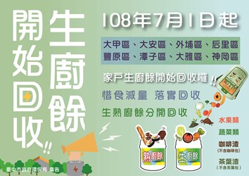 為發展綠色能源,台中市政府興建外埔綠能生態園區,推動生廚餘發電技術,配合第一階段運轉處理量,自7月1日起,優先針對大甲、大安、外埔、后里、豐原、潭子、大雅及神岡等八區啟動生廚餘回收作業,歡迎民眾利用市府提供或是自行準備的適當容器收集生廚餘,並交由清潔隊垃圾車沿街收運,為環保盡一份心力。
