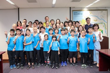 大坑國小校長趙秋英今日帶領五年級學生拜訪市府,向盧市長說明發展文心蘭課程的故事與規劃,以及參與淨山活動的心得,包括教育局長楊振昇、北屯區長李印欽等人都仔細聆聽。