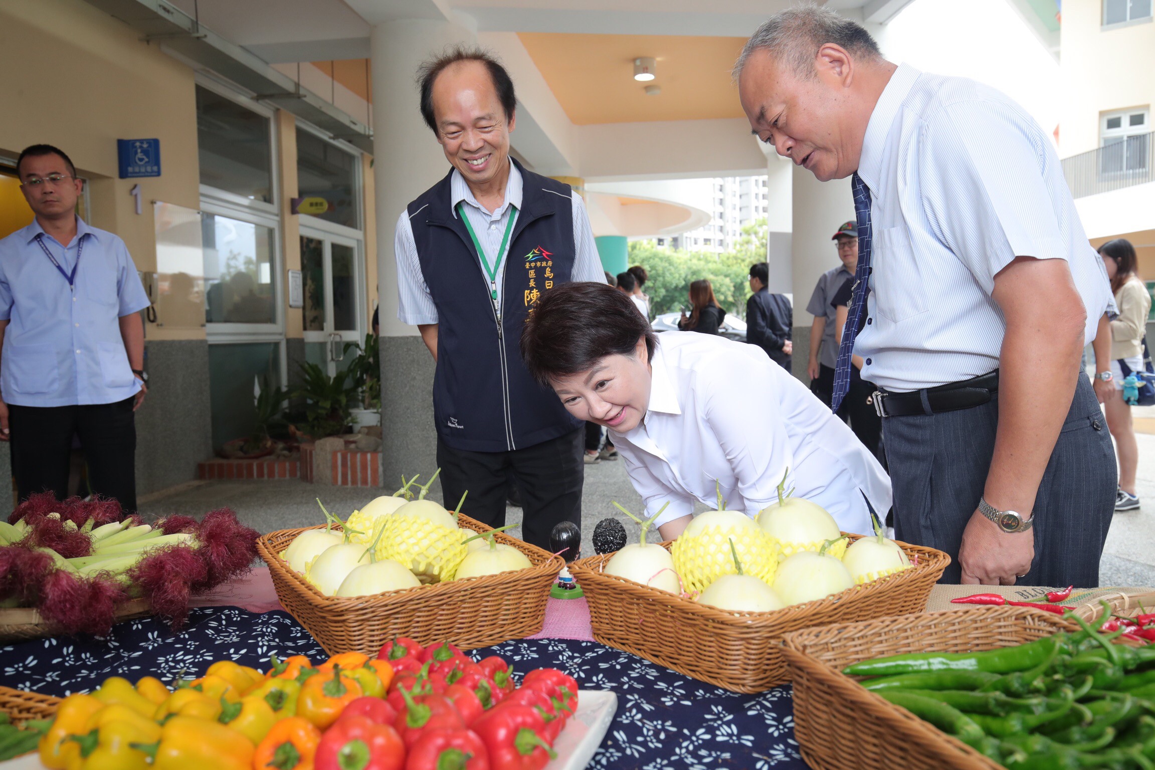 今日行動市政會議移師烏日區,現場展示農會輔導農民所生產的烏農米、雞蛋、小黃瓜、玉米筍、 洋香瓜等優質農特產品,盧市長在烏日區長陳嘉榮、烏日區農會總幹事楊義榮陪同下,品嚐了小黃瓜與玉米筍,直呼新鮮又好吃,可說是美容聖品,同時推薦大家可作為贈禮的絕佳選擇。