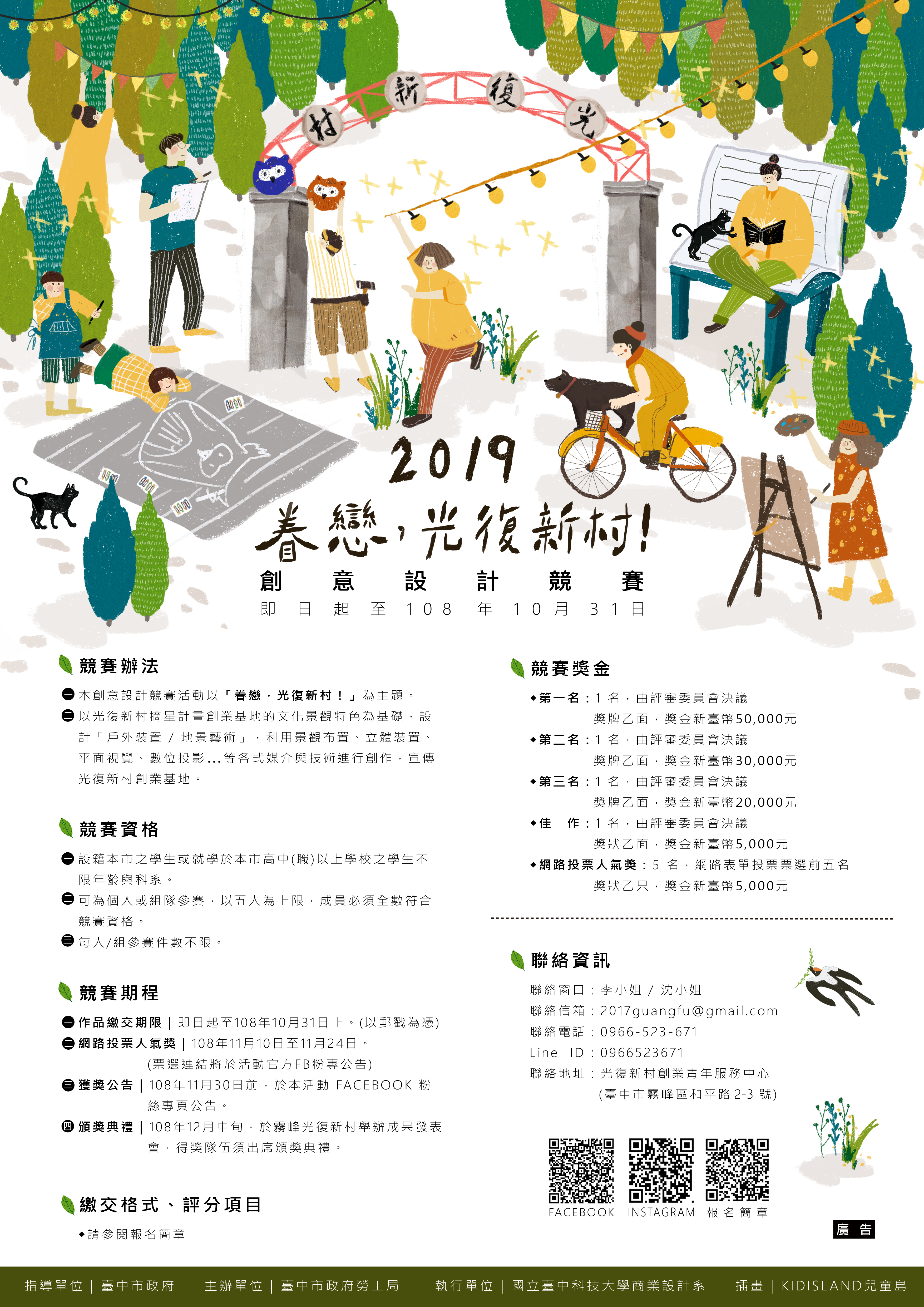 「眷戀,光復新村!」創意設計競賽活動開跑囉!台中市政府勞工局徵求創意發想,將富含歷史、人文、景觀等概念創意融入光復新村景觀,設計戶外裝置或地景藝術,展現光復新村新風貌及文化蘊涵。第一名優勝將頒發5萬元獎金,總獎金超過10萬元,即日起收件至10月31日止,歡迎踴躍參加。