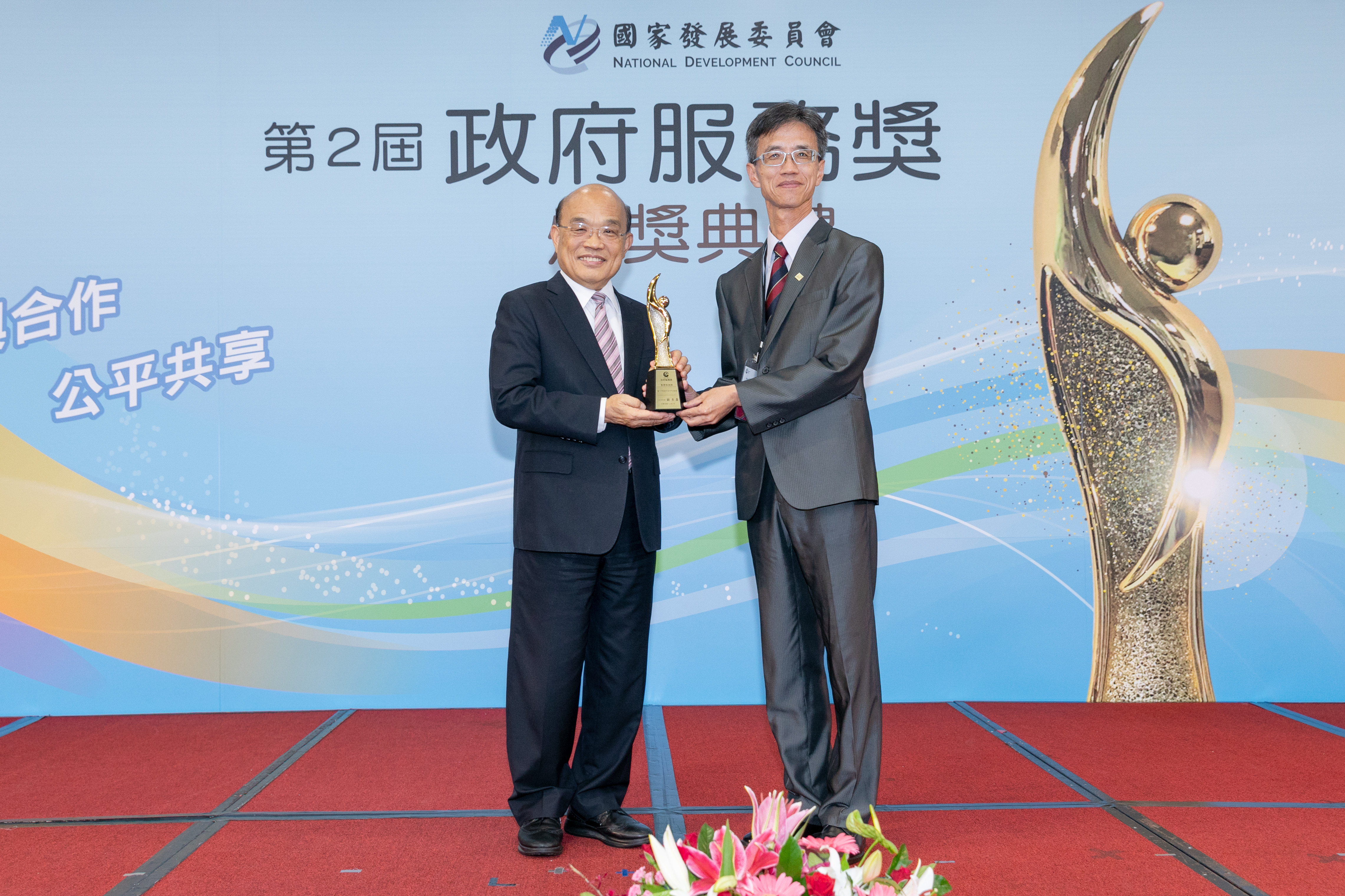 地稅局長沈政安(右)日前接受行政院長蘇貞昌(左)頒與第二屆政府服務獎獎座