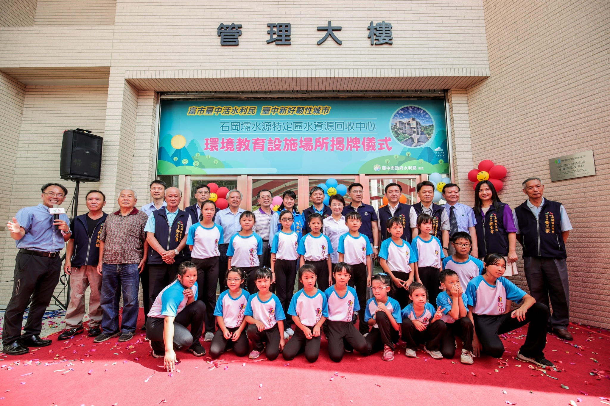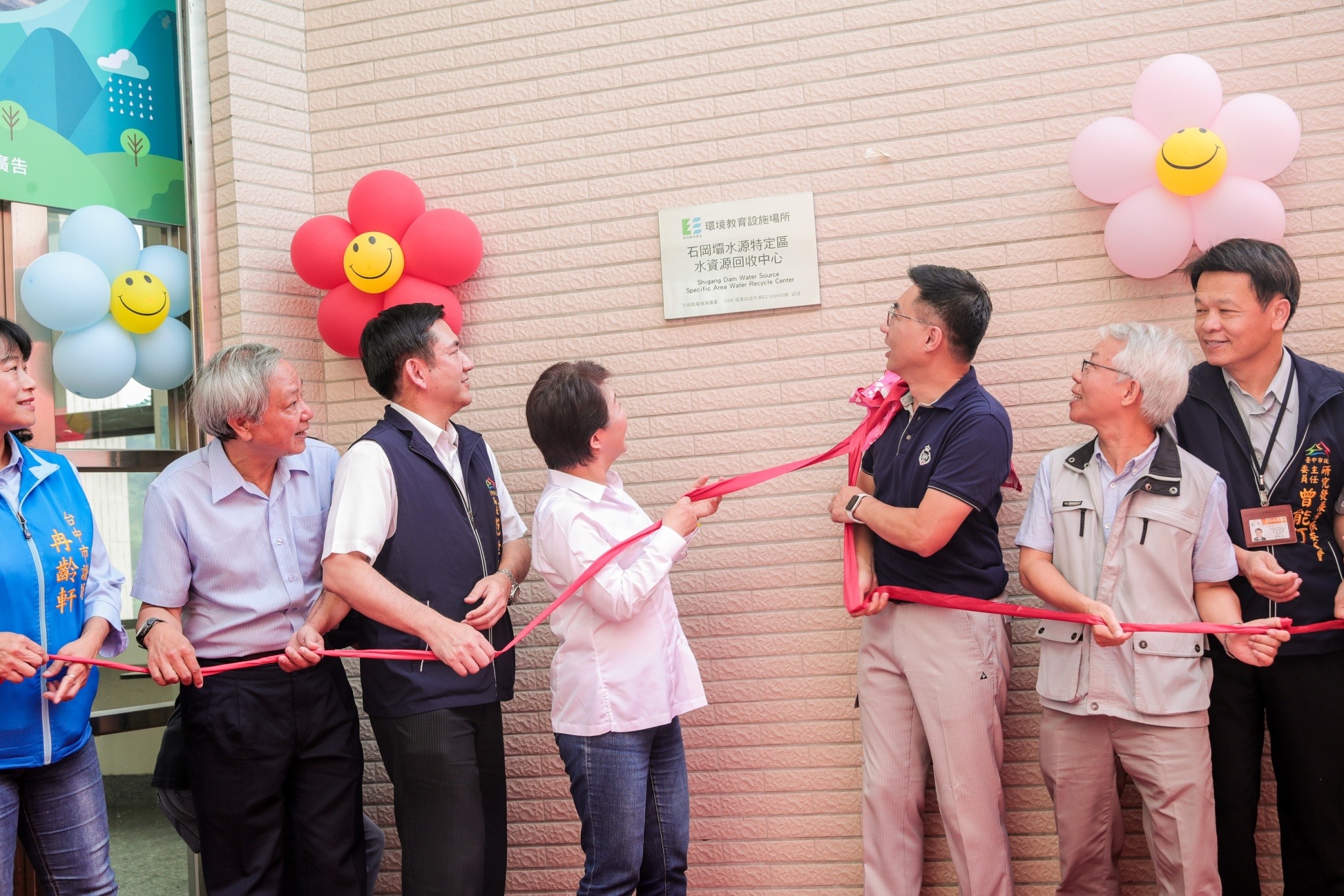 今日石岡壩水源特定區水資源回收中心環境教育設施場所揭牌儀式,包括盧市長、立法委員江啟臣、市議員冉齡軒、台灣自來水股份有限公司豐原給水廠廠長楊金龍、水利局長范世億、研究發展考核委員會主委曾能汀、石岡區長劉素幸、石岡國小校長吳錦章及多位在地里長皆到場見證。