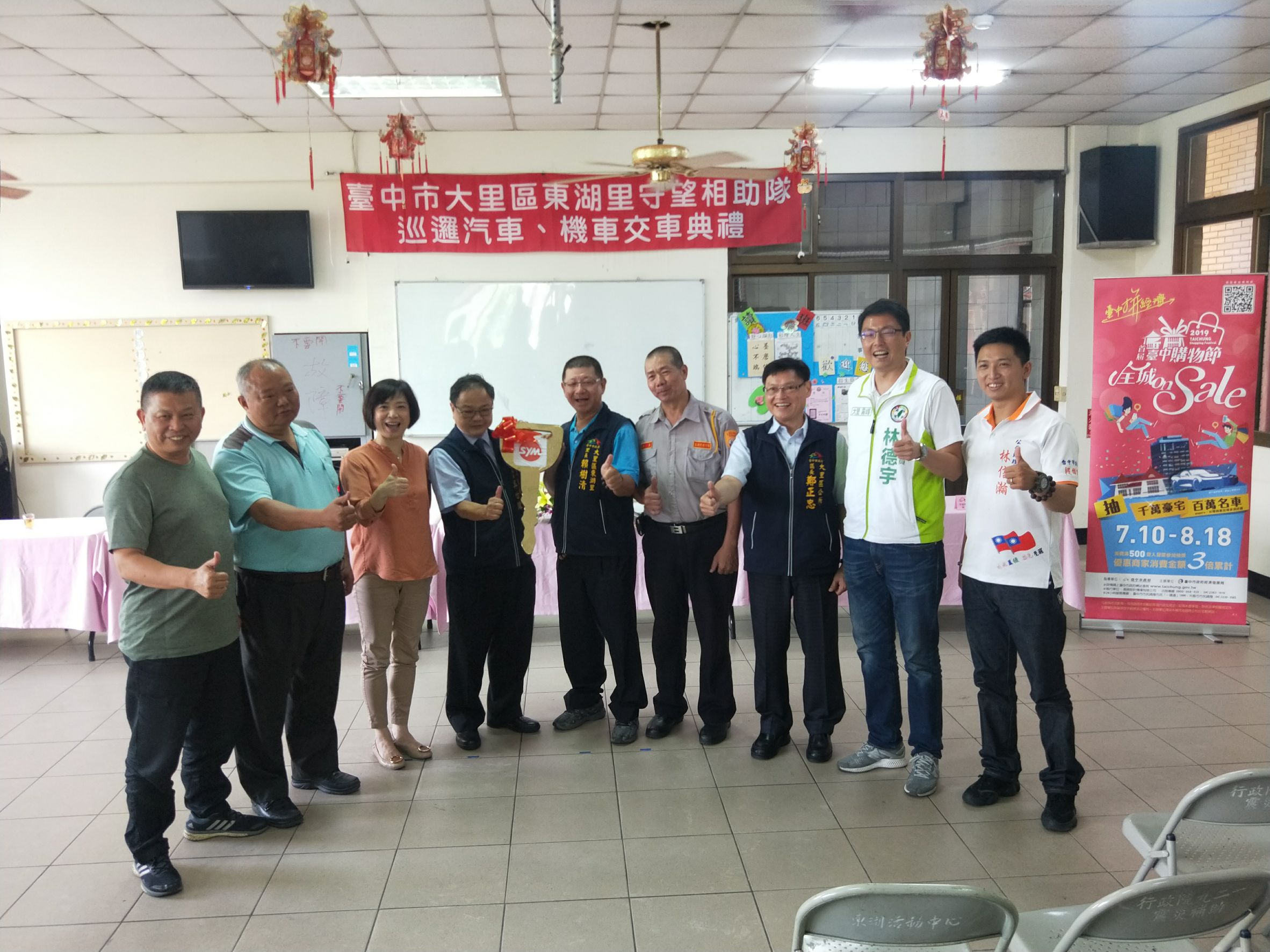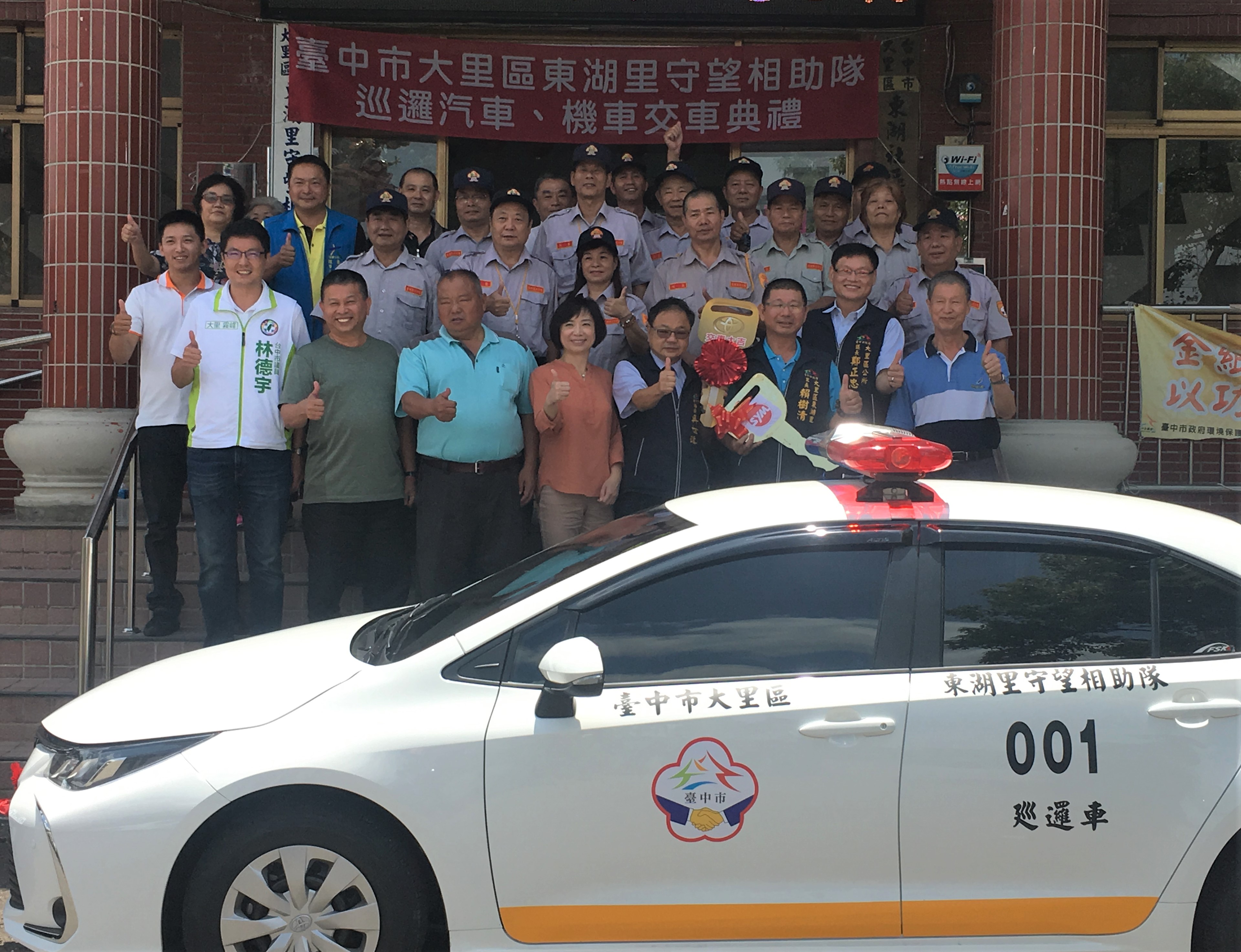 大里區東湖里人口數多達12千多人,里守望相助隊自100年成立迄今,有59名隊員,里內設有48個巡邏點,由於需巡邏區域相對較大,隊員們常犧牲夜間睡眠時間協助警力巡邏。台中市政府民政局日前補助東湖里守望相助隊購置巡邏汽、機車,並於今(15)日舉行交車儀式,民政局長吳世瑋將巡邏車輛交接給守望相助隊,希望提高隊員執勤安全並提振士氣。