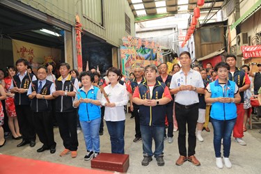 盧市長、民政局長吳世瑋今早分別擔任主、陪祭官,帶領廟方人員向城隍獻供祝壽,包括豐原區長徐照山、議員張瀞分、王朝坤、陳本添、立委江啟臣服務處主任江紅,以及當地多位里長皆到場祈福上香,場面莊嚴肅穆。