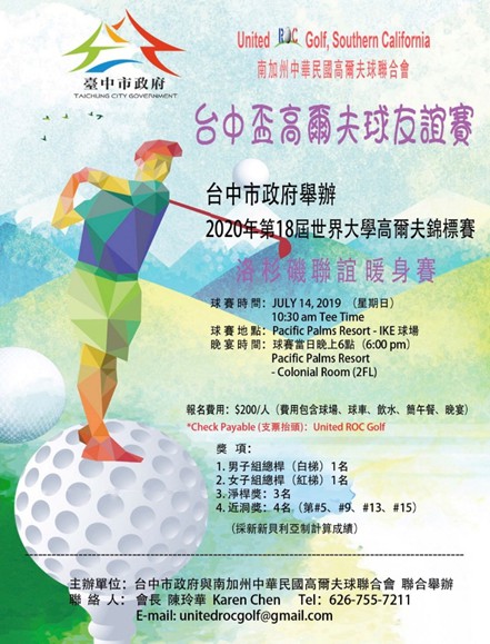 令狐副市長強調,這次特別感謝南加州中華民國高爾夫球聯合會會長陳玲華的精心策畫,讓台中盃高爾夫球友誼賽圓滿成功。台中市將於20206月主辦第18屆世界大學高爾夫錦標賽,廣邀170個國際大學運動總會(FISU)的會員國參加,盛況可期。