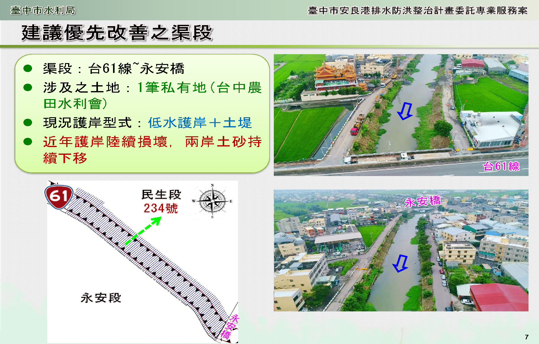 為改善安良港排水沿線護岸老舊破損及區域淹水問題,台中市政府水利局將辦理安良港排水整體防洪治理,整治範圍將由臨港一號橋至南勢溪匯流口止,全長約3.8公里,總工程經費約6.3億元。水利局表示,市府將積極向中央爭取納入前瞻基礎建設計畫經費補助,以解決地方淹水疑慮。