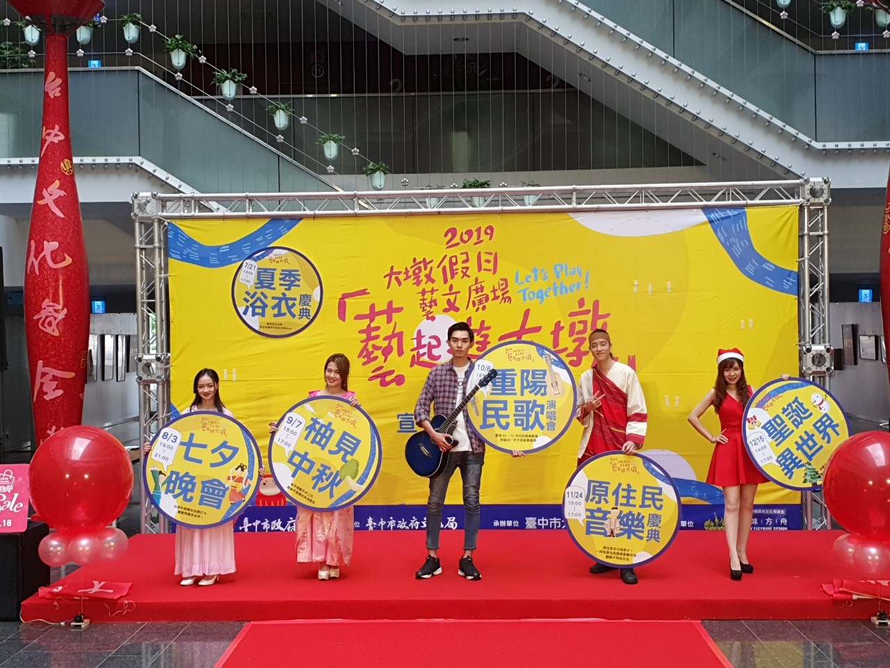 今日大墩文化中心舉辦假日藝文廣場活動記者會,宣布今年主軸為「藝起遊大墩」,每月有不同活動主題,包括7月21日(星期日)「夏季浴衣慶典」、8月3日(星期六)「七夕晚會」、9月7日(星期六)「柚見中秋」、10月6日(星期日)「重陽民歌演唱會」、11月24日(星期日)「原住民音樂慶典」和12月15日(星期日)「聖誕異世界」等。