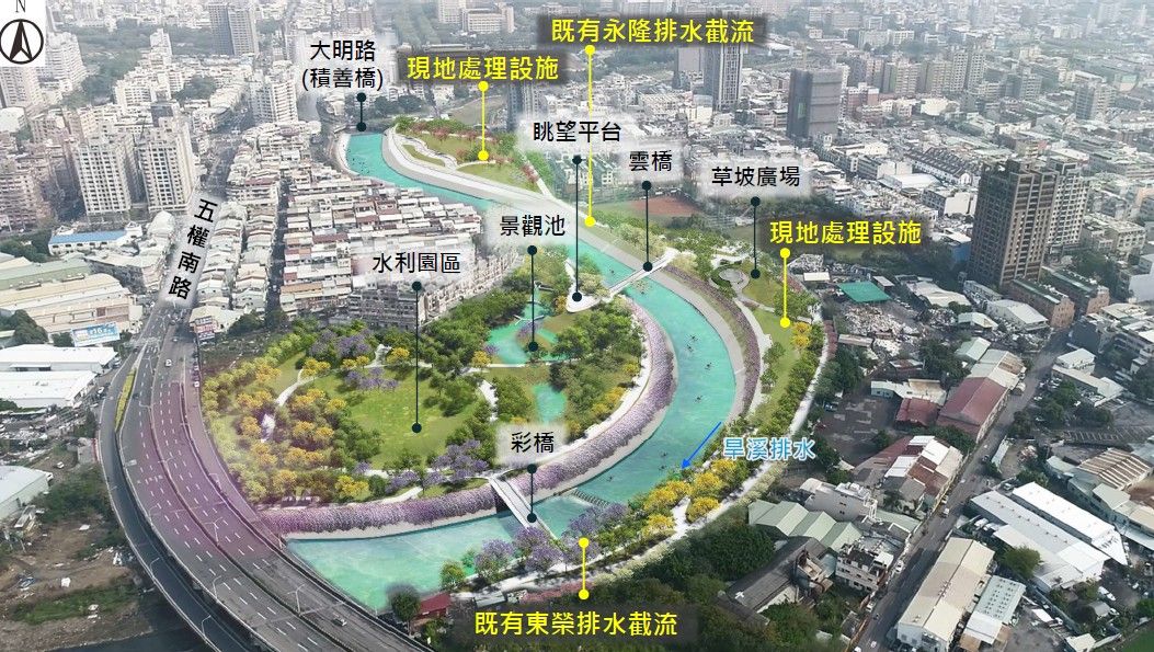 為此,在設計規劃階段,市府優先改善園區林木間距,將過於密植的蘭花楹及風鈴木疏植;為更有效使用並提升旱溪排水左右岸用地,工程規劃2處人行橋,未來民眾可在園區內環繞暢行而無需繞道,希望能以花園城市的概念為市民打造一座後花園秘境。(7/25*22)*水利局