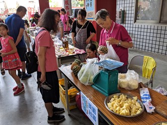 台中市政府農業局輔導霧峰區萊園社區辦理「萊園來𨑨迌假日市集推廣計畫」農產品行銷推廣活動,今(28)日在霧峰區南天宮廟埕廣場登場,推廣在地優質好吃的鳳梨、龍眼等特色農產品及文創商品,並結合農村古早童玩闖關遊戲,引領民眾走入時光隧道,體驗「不插電」的童玩樂趣,豐富有趣的活動吸引許多民眾參加,氣氛熱鬧。