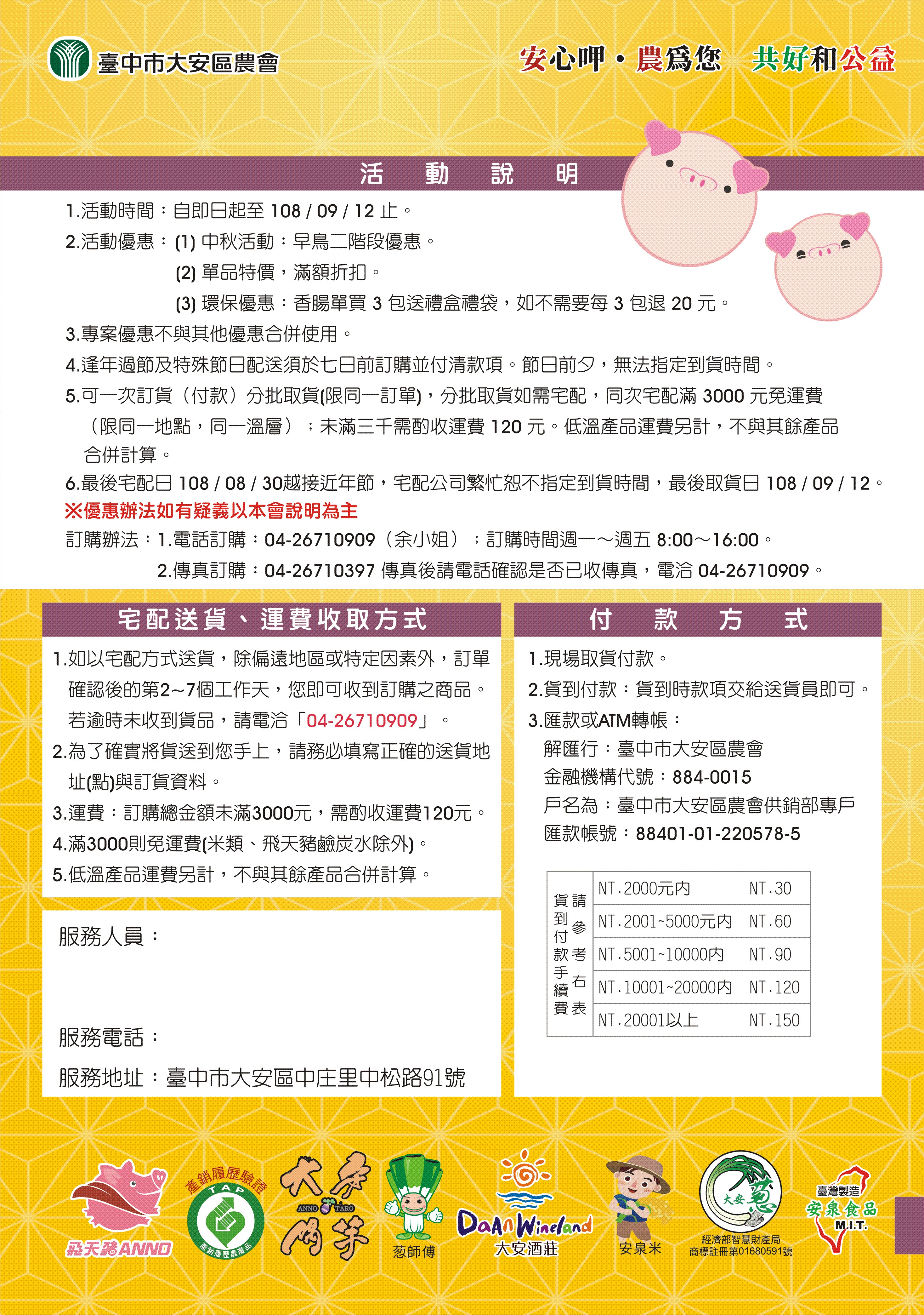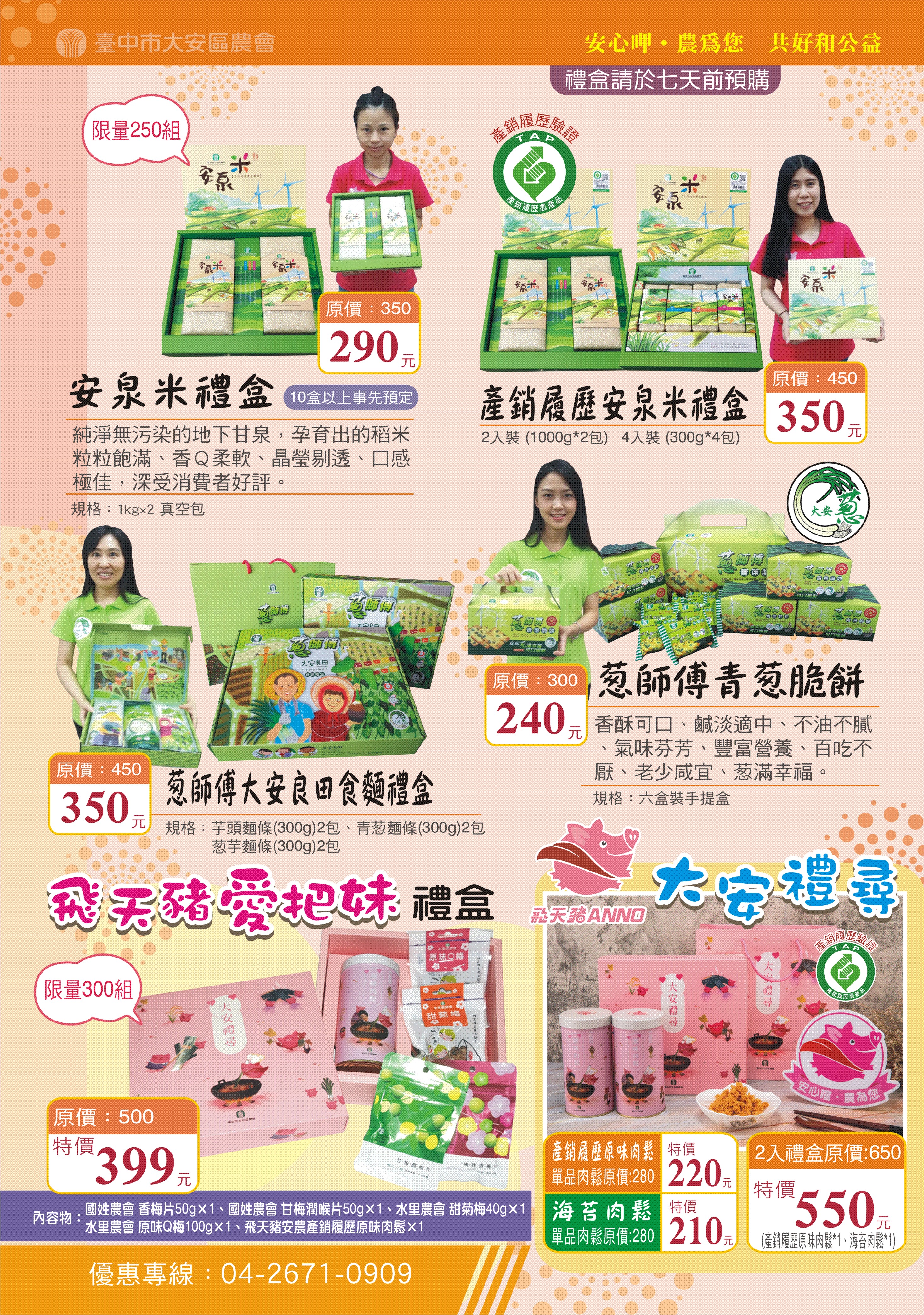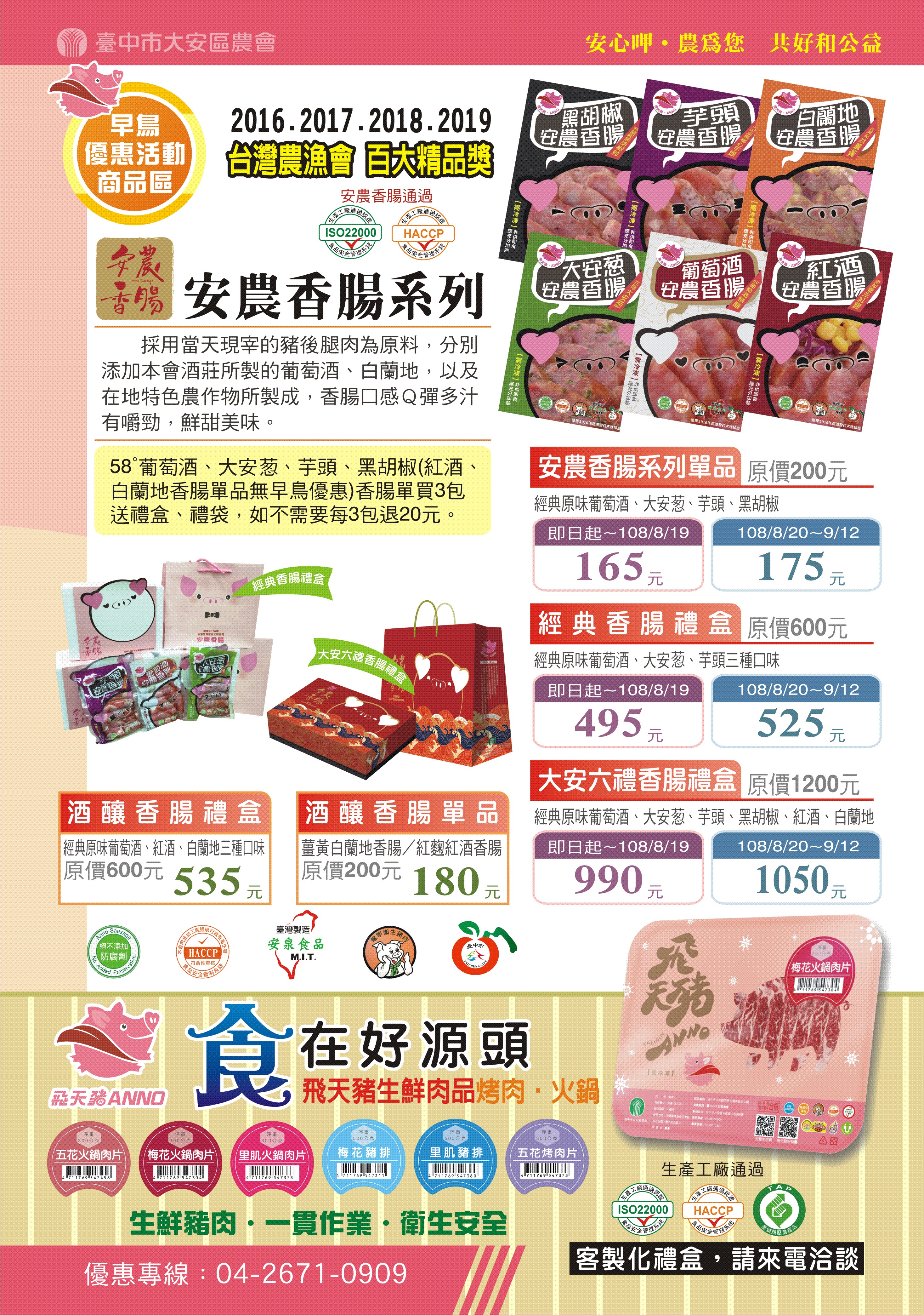 大安農會配合中秋節,推出2階段禮盒優惠,第一階段自即日起至8月19日,第二階段自8月20日至9月12日,2階段均提供不同優惠,優惠商品包括飛天豬愛把妹禮盒、飛天豬豪華烤肉禮盒組、安農香腸系列包含禮盒、飛天豬鹹豬肉系列、飛天豬貢丸系列、蔥師傅系列產品、大安偶芋禮盒、產銷履歷安泉米禮盒、大安好酒系列等多項農產精品,更多相關訊息請上飛天豬ANNO FB粉絲團( http://www.facebook.com/annofood/ )或大安區農會網站 ( http://daanfa.naffic.org.tw )查詢。