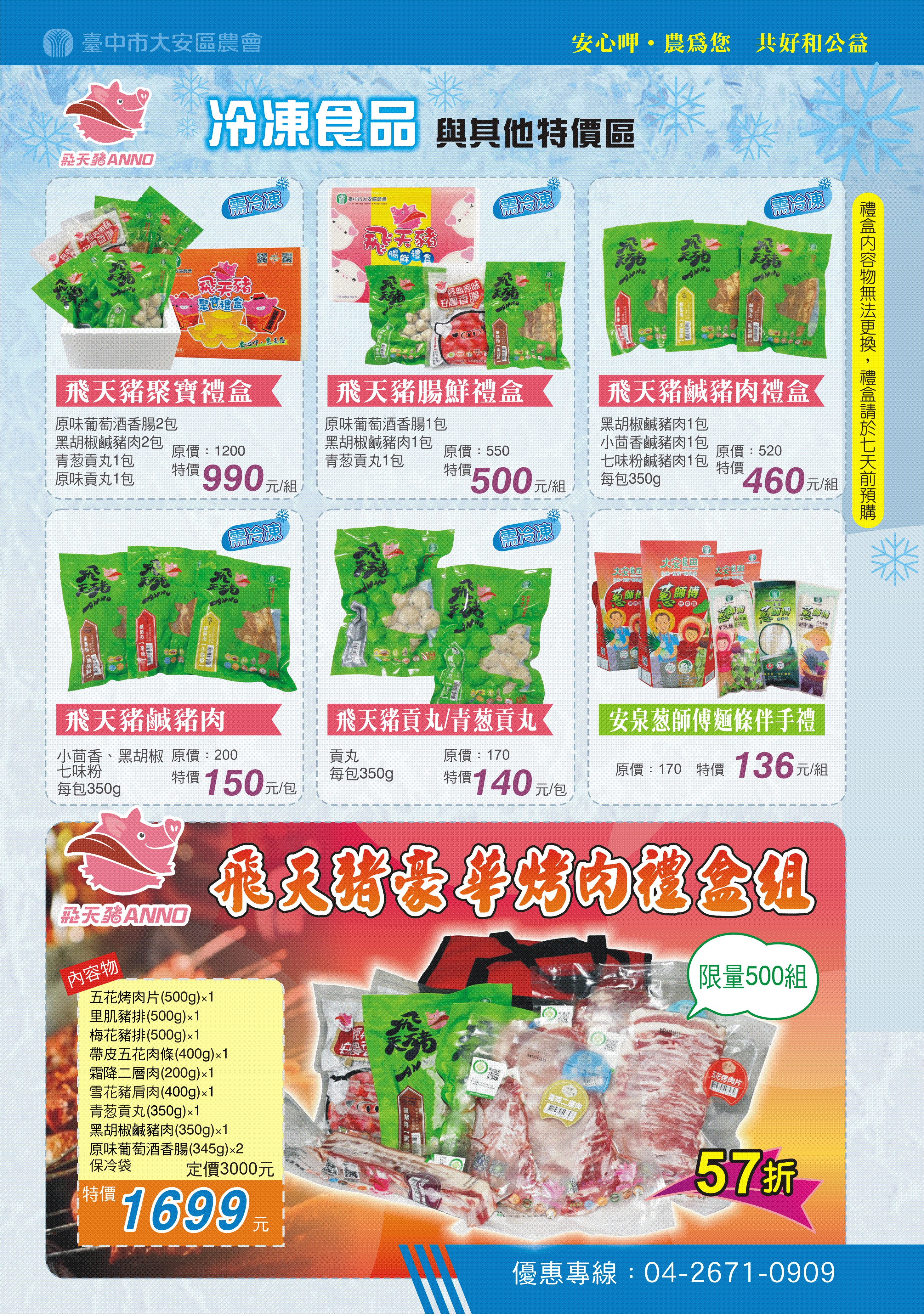 農業局表示,大安農會已連續4年蟬聯台灣農漁會百大精品獎殊榮,品牌形象獲肯定,所生產的飛天豬生鮮肉品均經產銷履歷驗證,生產過程從拍賣、電宰、分切至加工製程均透明化,讓消費者能安心食用。(7/30*13)*農業局