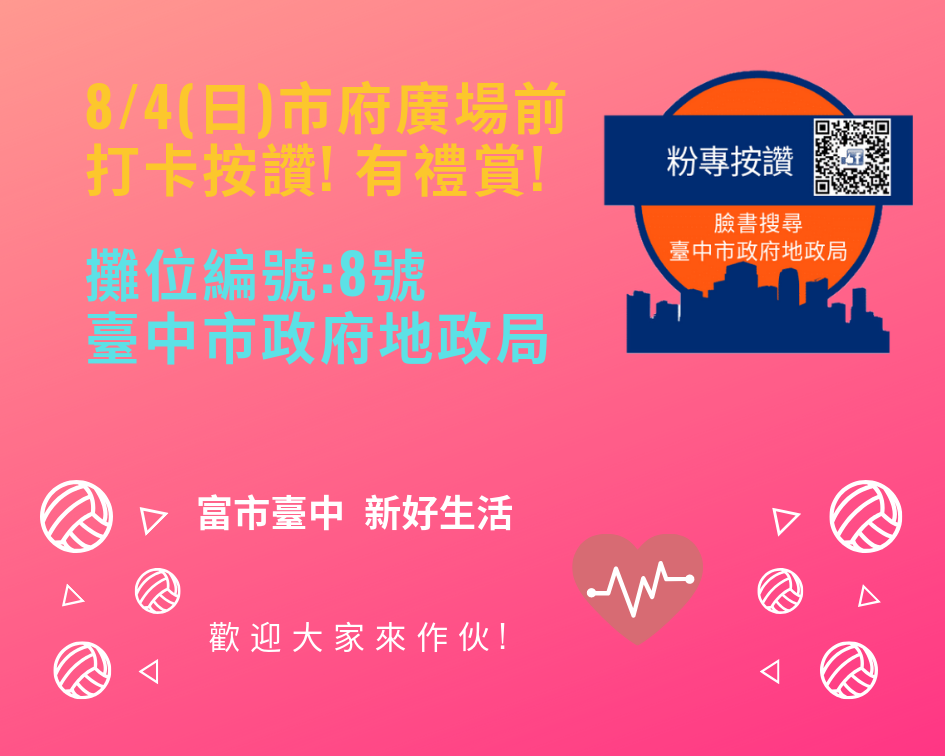 吳局長進一步說明,攤位現場也安排「臉書粉專打卡按讚」活動,民眾利用手機或平版電腦等手持式行動裝置,到地政局臉書粉專打卡按讚,即可獲得精美宣導品1份,數量有限,歡迎把握機會。地政查詢服務網址( http://im.land.taichung.gov.tw/photoGallery/secretary.aspx )。(8/1*22)*地政局